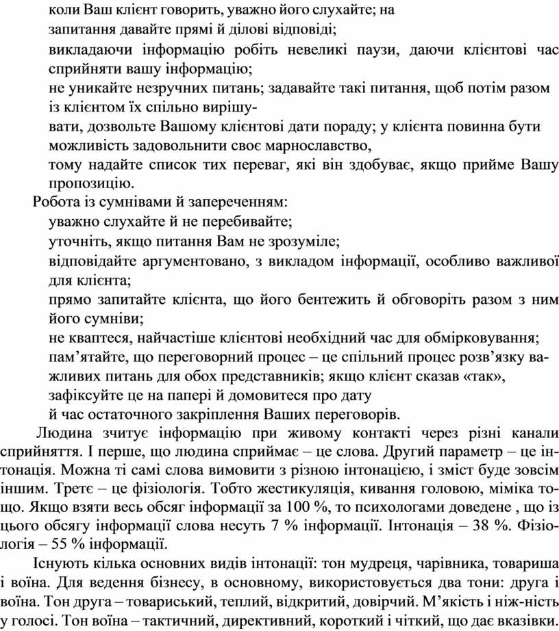 Людина зчитує інформацію при живому контакті через різні канали сприйняття. І перше, що людина сприймає – це слова. Другий параметр – це ін-тонація. Можна ті самі слова вимовити з різною інтонацією, і зміст буде зовсім іншим. Третє – це фізіологія. Тобто жестикуляція, кивання головою, міміка то-що. Якщо взяти весь обсяг інформації за 100 %, то психологами доведене , що із цього обсягу інформації слова несуть 7 % інформації. Інтонація – 38 %. Фізіо-логія – 55 % інформації.