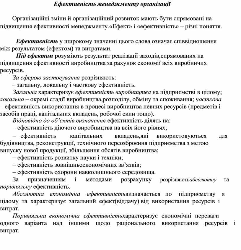 Організаційні зміни й організаційний розвиток мають бути спрямовані на підвищення ефективності менеджменту.«Ефект» і «ефективність» – різні поняття.