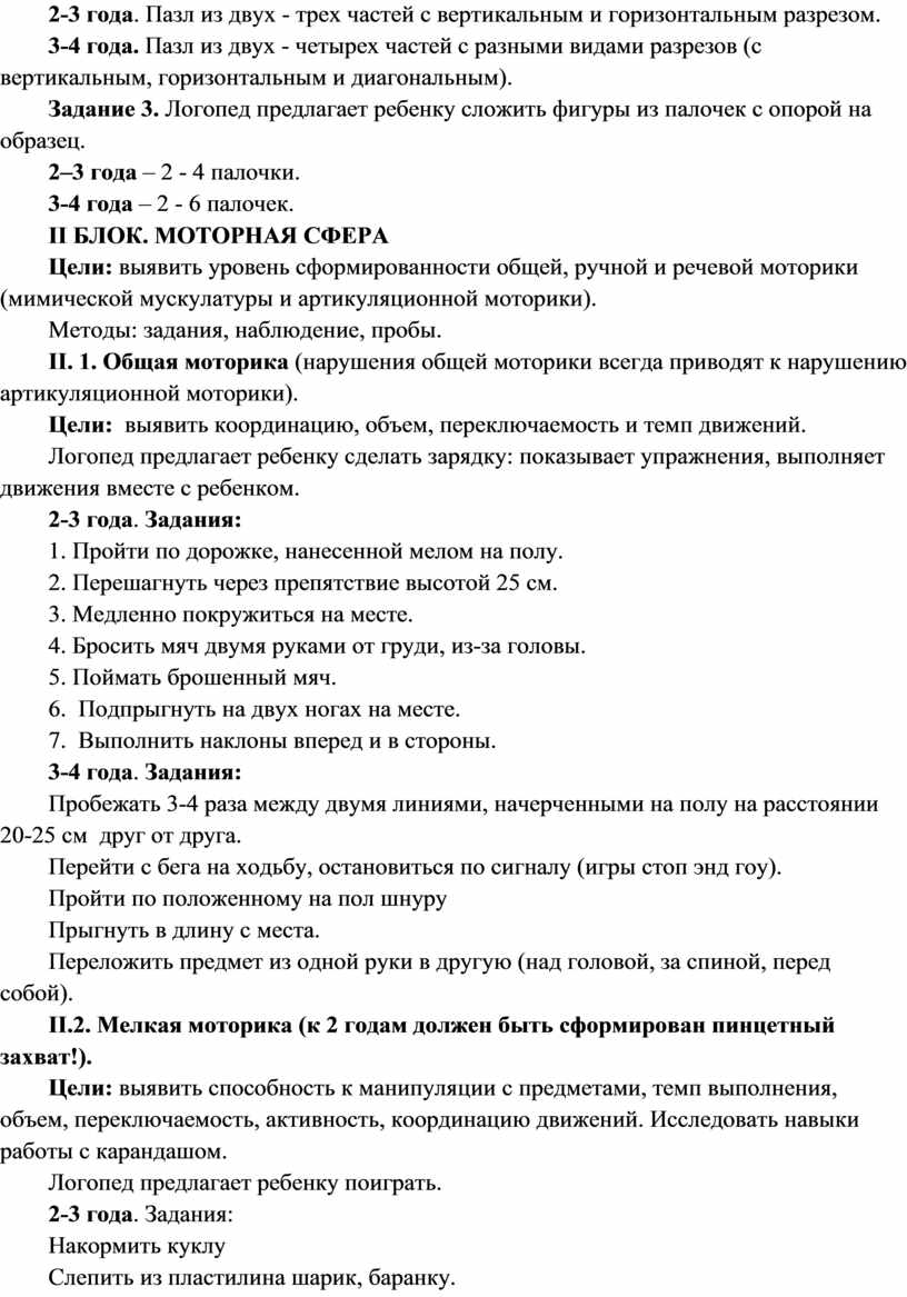 Цели: выявить уровень сформированности общей, ручной и речевой моторики (мимической мускулатуры и артикуляционной моторики).