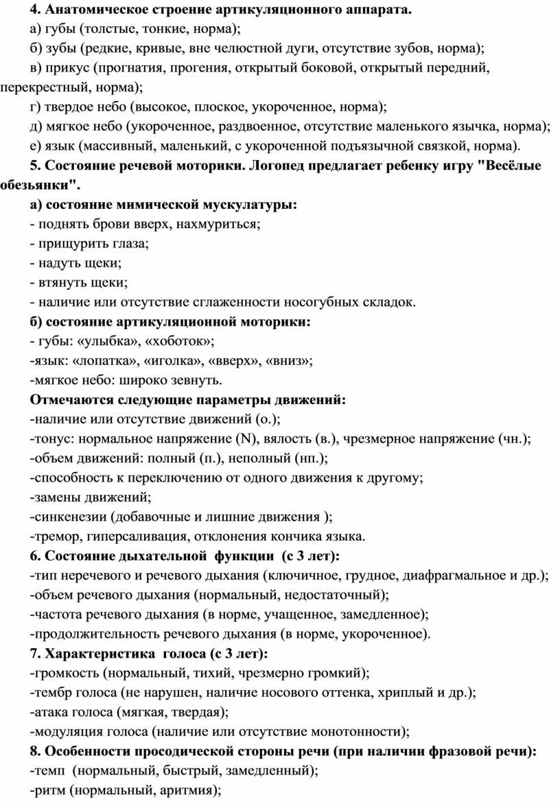 Цели: выявить характер нарушения звукопроизношения и звуко-слоговой структуры слов; особенности анатомического строения артикуляционного аппарата; параметры движений мимической и артикуляционной моторики, особенности дыхания и просодической строны речи.