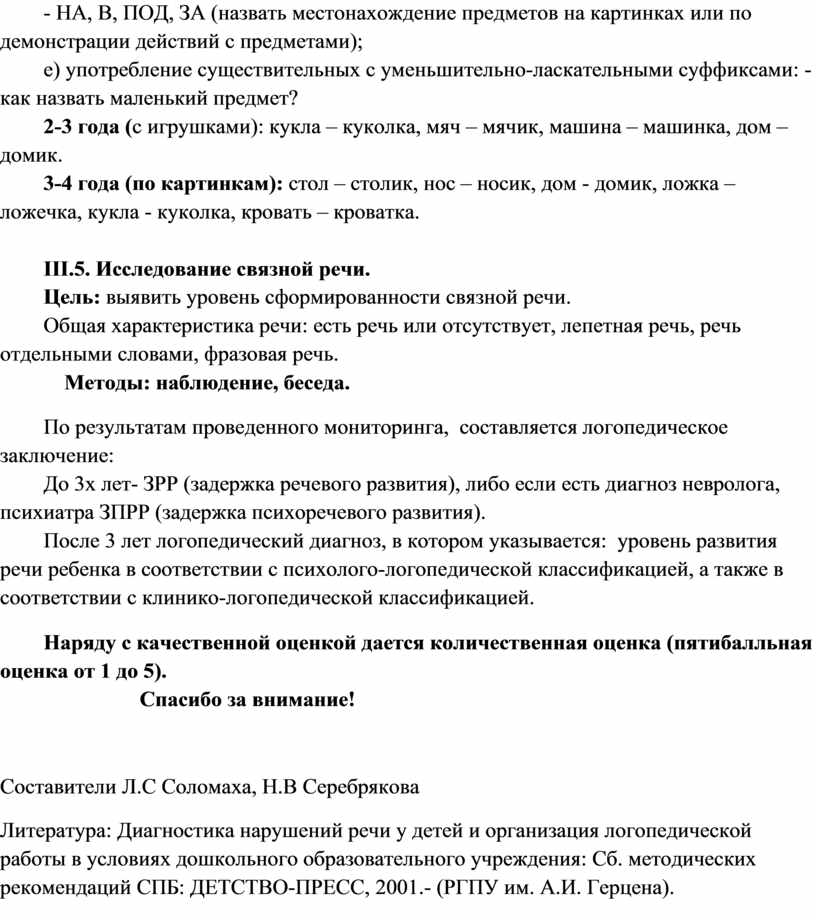 Литература: Диагностика нарушений речи у детей и организация логопедической работы в условиях дошкольного образовательного учреждения: Сб. методических рекомендаций СПБ: ДЕТСТВО-ПРЕСС, 2001.- (РГПУ им. А.И. Герцена).