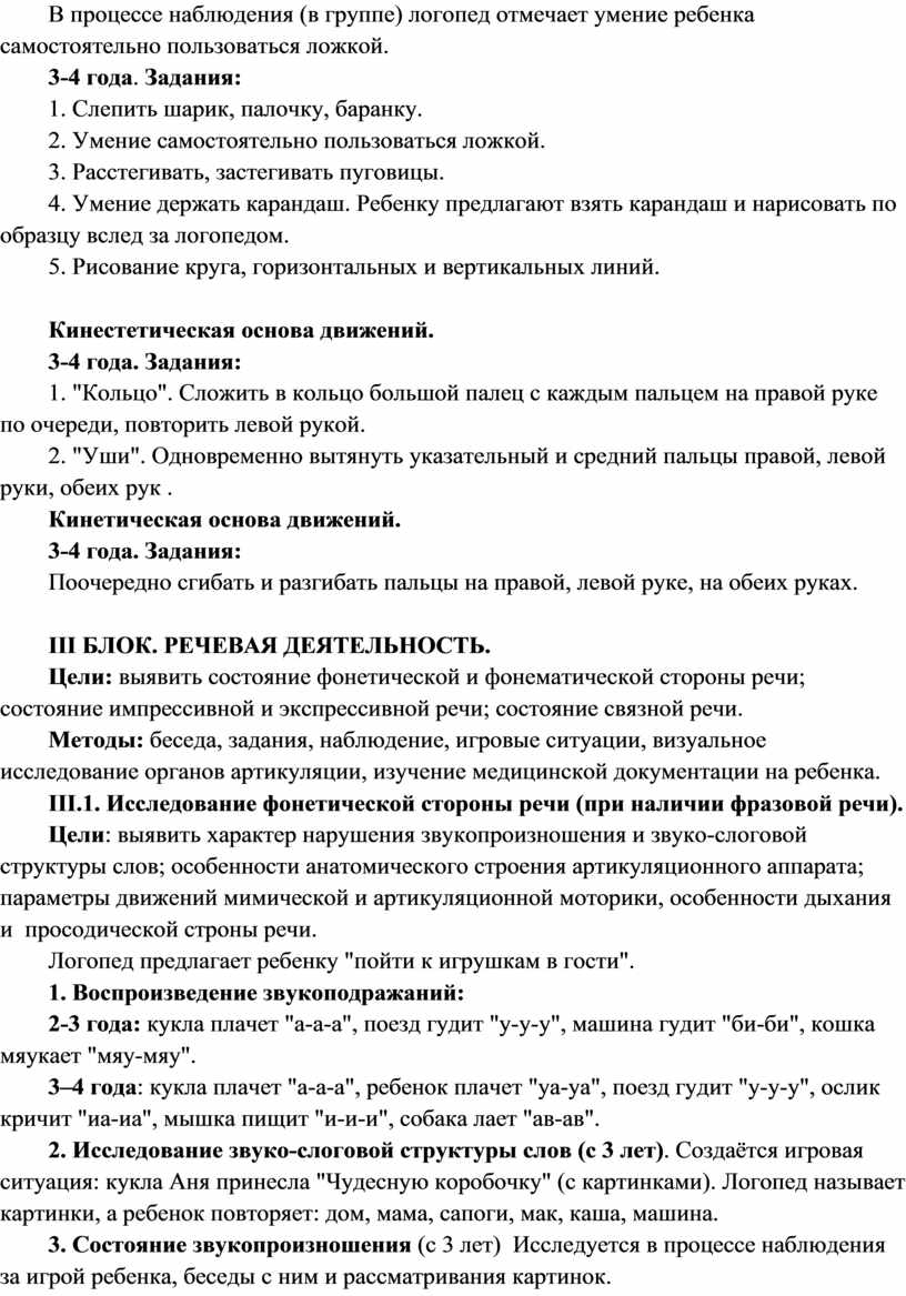 Третий раздел «речевая деятельность» направлен на исследование произносительной стороны речи, фонематических процессов, импрессивной и экспрессивной речи.