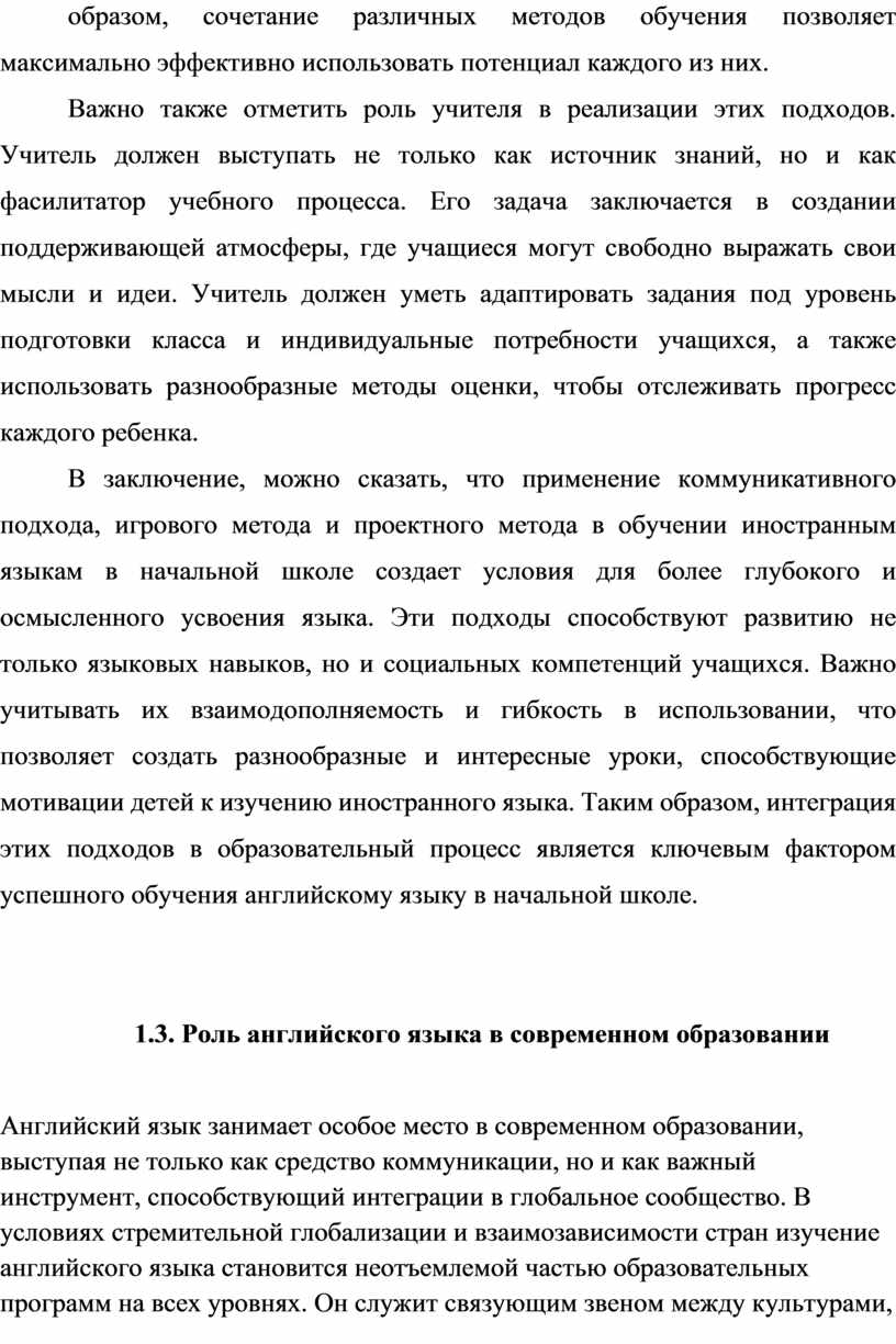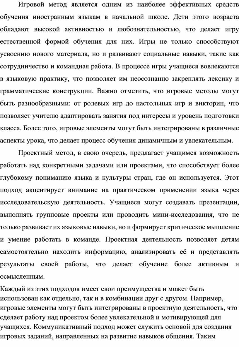 В заключение, можно сказать, что применение коммуникативного подхода, игрового метода и проектного метода в обучении иностранным языкам в начальной школе создает условия для более глубокого и осмысленного усвоения языка. Эти подходы способствуют развитию не только языковых навыков, но и социальных компетенций учащихся. Важно учитывать их взаимодополняемость и гибкость в использовании, что позволяет создать разнообразные и интересные уроки, способствующие мотивации детей к изучению иностранного языка. Таким образом, интеграция этих подходов в образовательный процесс является ключевым фактором успешного обучения английскому языку в начальной школе.