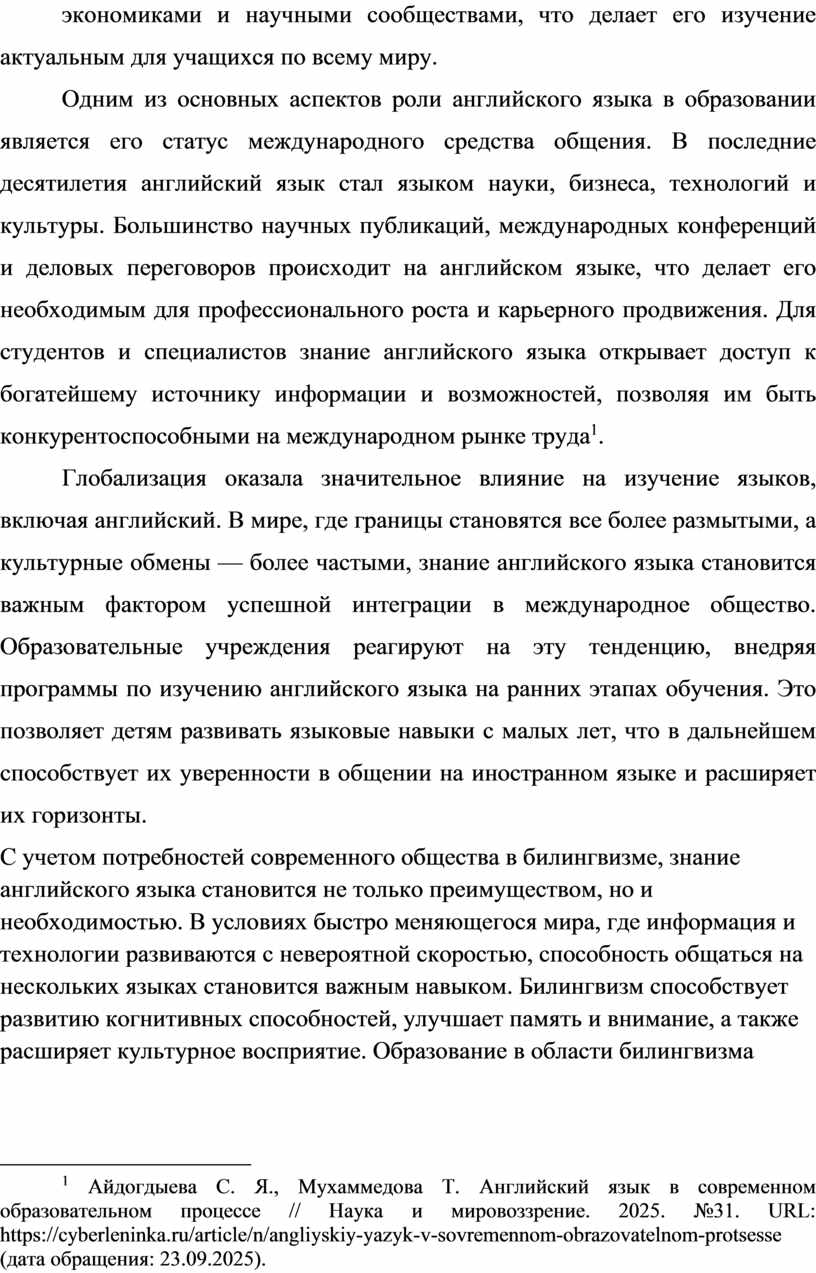 5. Айдогдыева С. Я., Мухаммедова Т. Английский язык в современном образовательном процессе // Наука и мировоззрение. 2025. №31. URL: https://cyberleninka.ru/article/n/angliyskiy-yazyk-v-sovremennom-obrazovatelnom-protsesse (дата обращения: 23.09.2025).