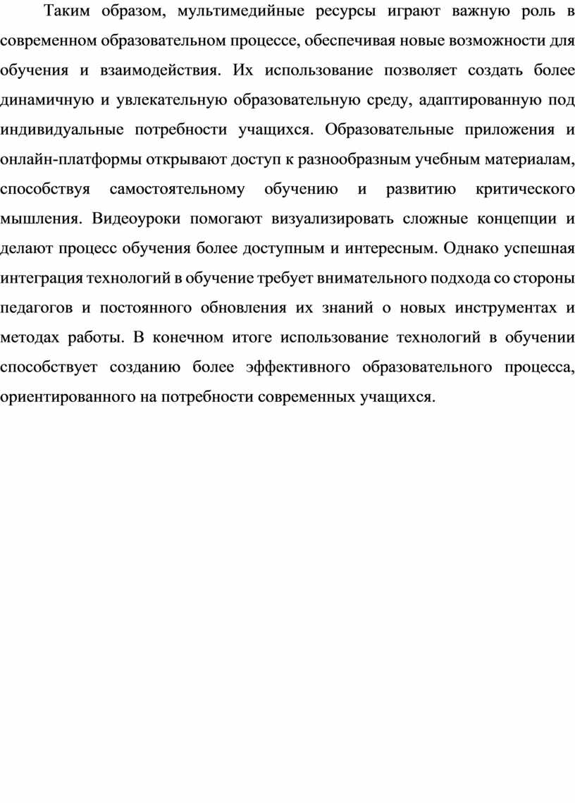 Таким образом, мультимедийные ресурсы играют важную роль в современном образовательном процессе, обеспечивая новые возможности для обучения и взаимодействия. Их использование позволяет создать более динамичную и увлекательную образовательную среду, адаптированную под индивидуальные потребности учащихся. Образовательные приложения и онлайн-платформы открывают доступ к разнообразным учебным материалам, способствуя самостоятельному обучению и развитию критического мышления. Видеоуроки помогают визуализировать сложные концепции и делают процесс обучения более доступным и интересным. Однако успешная интеграция технологий в обучение требует внимательного подхода со стороны педагогов и постоянного обновления их знаний о новых инструментах и методах работы. В конечном итоге использование технологий в обучении способствует созданию более эффективного образовательного процесса, ориентированного на потребности современных учащихся.