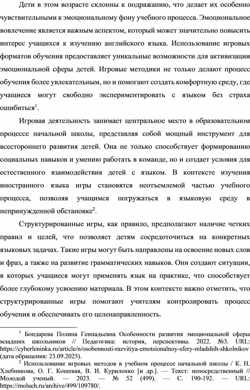 [3] Использование игровых методов в учебном процессе начальной школы / К. Н. Хлебникова, О. Г. Кошевая, В. И. Куриленко [и др.]. — Текст: непосредственный // Молодой ученый. — 2023. — № 52 (499). — С. 190-192. — URL: https://moluch.ru/archive/499/109780/.