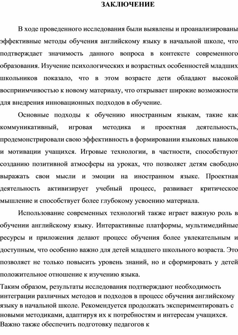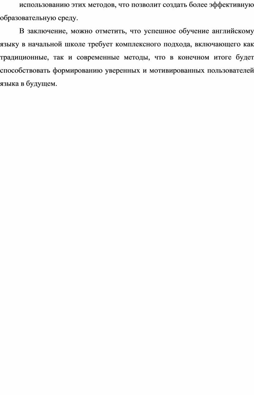 В заключение, можно отметить, что успешное обучение английскому языку в начальной школе требует комплексного подхода, включающего как традиционные, так и современные методы, что в конечном итоге будет способствовать формированию уверенных и мотивированных пользователей языка в будущем.