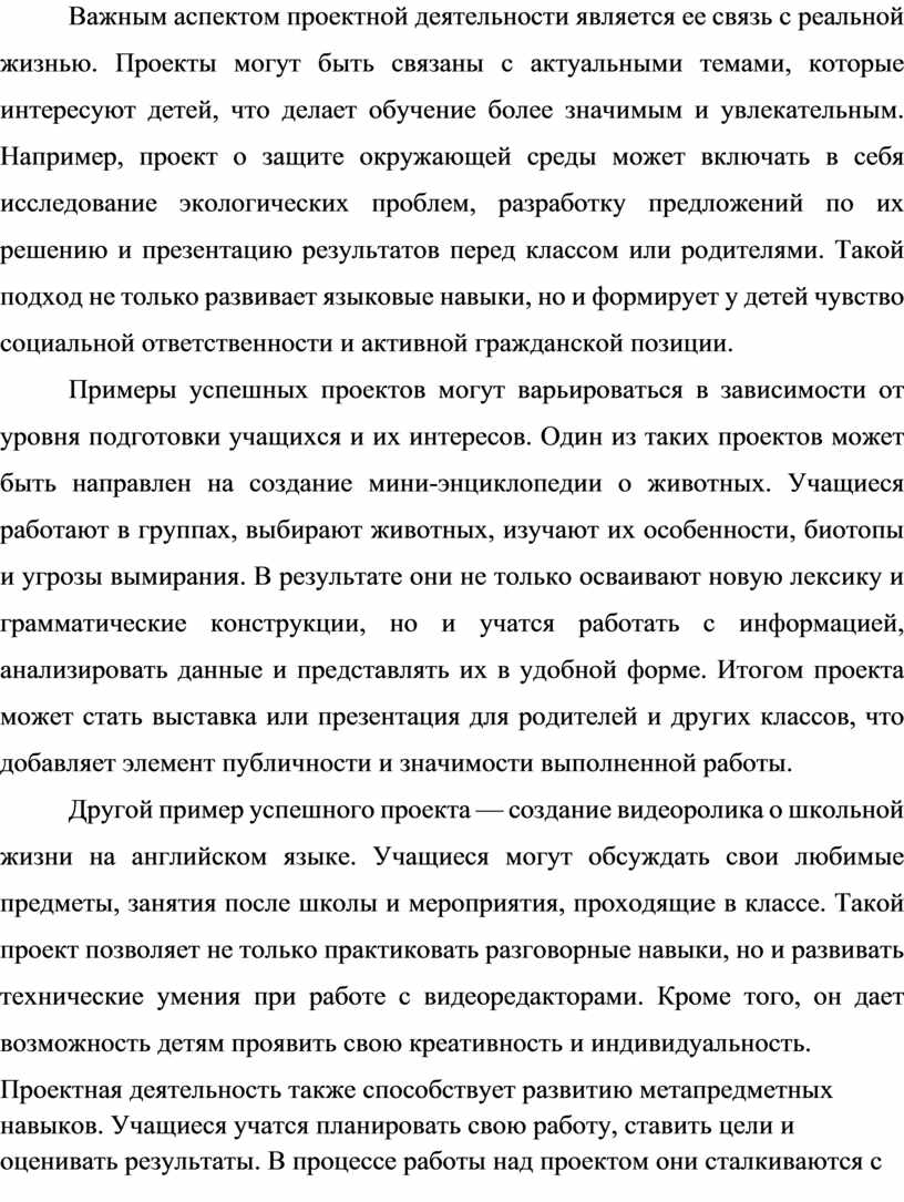 Важным аспектом проектной деятельности является ее связь с реальной жизнью. Проекты могут быть связаны с актуальными темами, которые интересуют детей, что делает обучение более значимым и увлекательным. Например, проект о защите окружающей среды может включать в себя исследование экологических проблем, разработку предложений по их решению и презентацию результатов перед классом или родителями. Такой подход не только развивает языковые навыки, но и формирует у детей чувство социальной ответственности и активной гражданской позиции.