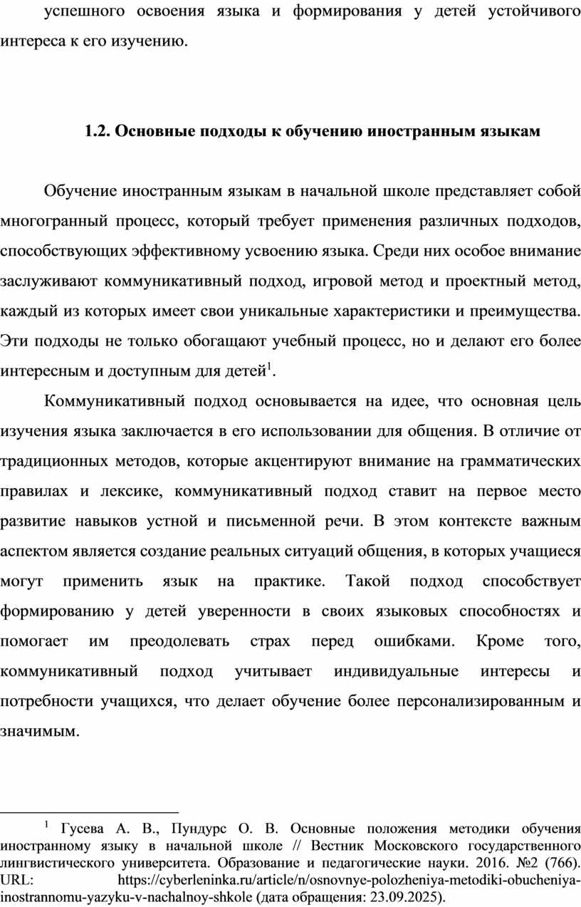 4. Гусева А. В., Пундурс О. В. Основные положения методики обучения иностранному языку в начальной школе // Вестник Московского государственного лингвистического университета. Образование и педагогические науки. 2016. №2 (766). URL: https://cyberleninka.ru/article/n/osnovnye-polozheniya-metodiki-obucheniya-inostrannomu-yazyku-v-nachalnoy-shkole (дата обращения: 23.09.2025).