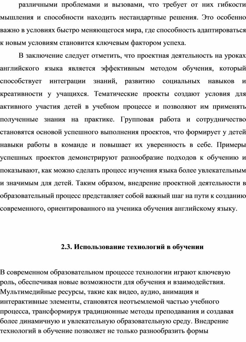 В заключение следует отметить, что проектная деятельность на уроках английского языка является эффективным методом обучения, который способствует интеграции знаний, развитию социальных навыков и креативности у учащихся. Тематические проекты создают условия для активного участия детей в учебном процессе и позволяют им применять полученные знания на практике. Групповая работа и сотрудничество становятся основой успешного выполнения проектов, что формирует у детей навыки работы в команде и повышает их уверенность в себе. Примеры успешных проектов демонстрируют разнообразие подходов к обучению и показывают, как можно сделать процесс изучения языка более увлекательным и значимым для детей. Таким образом, внедрение проектной деятельности в образовательный процесс представляет собой важный шаг на пути к созданию современного, ориентированного на ученика обучения английскому языку.