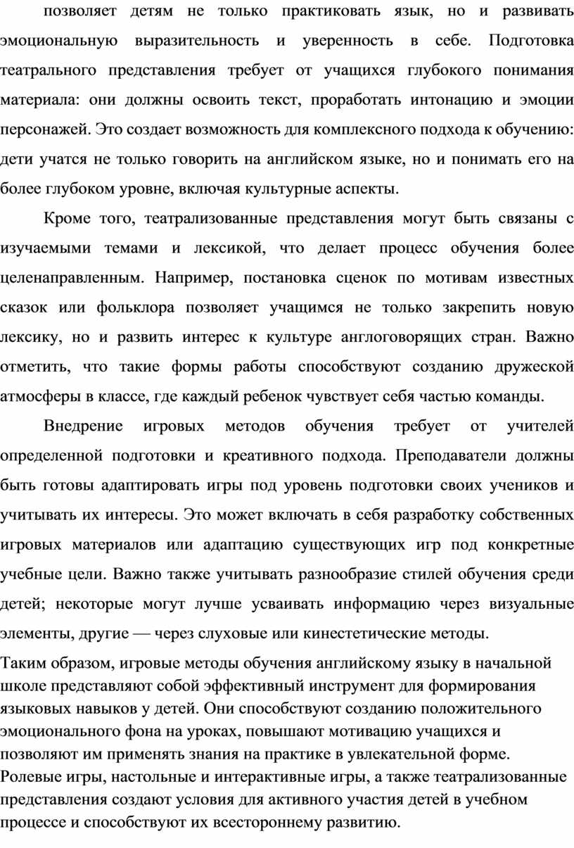 Таким образом, игровые методы обучения английскому языку в начальной школе представляют собой эффективный инструмент для формирования языковых навыков у детей. Они способствуют созданию положительного эмоционального фона на уроках, повышают мотивацию учащихся и позволяют им применять знания на практике в увлекательной форме. Ролевые игры, настольные и интерактивные игры, а также театрализованные представления создают условия для активного участия детей в учебном процессе и способствуют их всестороннему развитию. Важно продолжать исследовать и внедрять новые игровые методики в образовательный процесс для достижения максимальной эффективности обучения английскому языку на начальном этапе.
