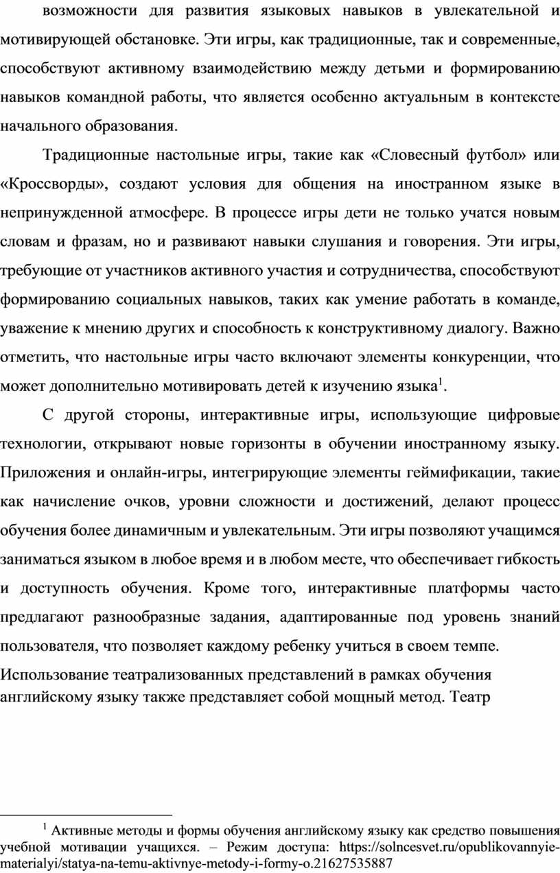 Игровые методы обучения занимают особое место в образовательном процессе, особенно в начальной школе, где возрастные особенности учеников требуют применения нестандартных подходов к обучению. В этом контексте использование игровых методов представляет собой не только способ повышения мотивации, но и эффективный инструмент для усвоения нового языка. Игровая деятельность способствует созданию положительной атмосферы на уроках, что в свою очередь влияет на уровень вовлеченности детей и их желание участвовать в обучении[6].