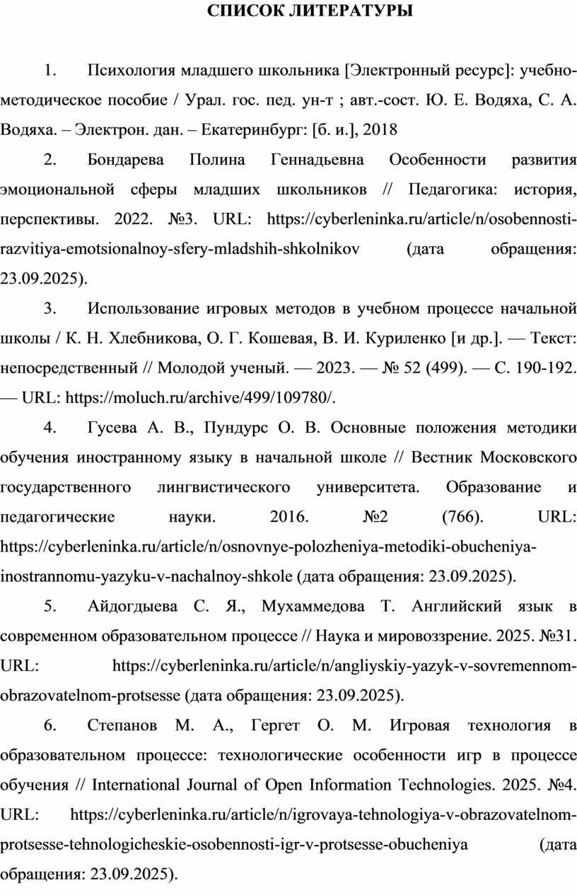 [4] Гусева А. В., Пундурс О. В. Основные положения методики обучения иностранному языку в начальной школе // Вестник Московского государственного лингвистического университета. Образование и педагогические науки. 2016. №2 (766). URL: https://cyberleninka.ru/article/n/osnovnye-polozheniya-metodiki-obucheniya-inostrannomu-yazyku-v-nachalnoy-shkole (дата обращения: 23.09.2025).