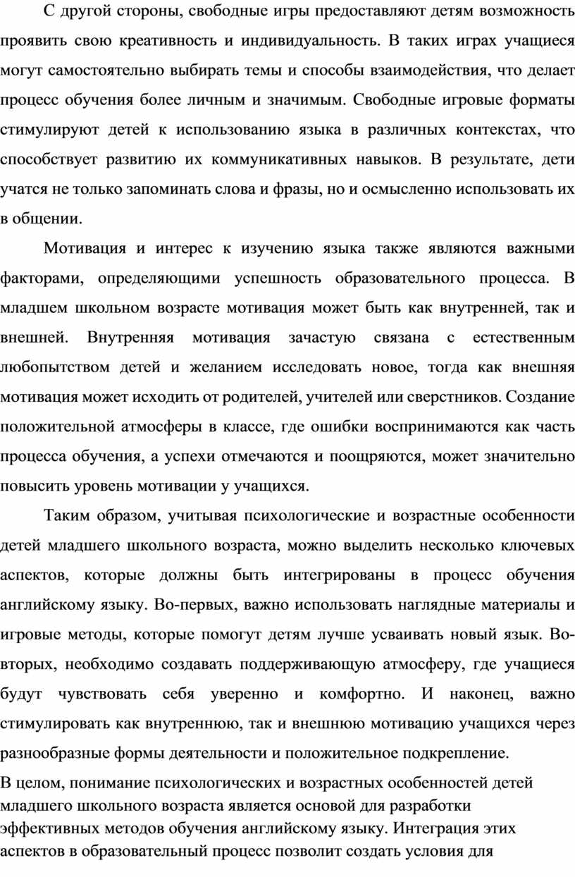 В целом, понимание психологических и возрастных особенностей детей младшего школьного возраста является основой для разработки эффективных методов обучения английскому языку. Интеграция этих аспектов в образовательный процесс позволит создать условия для успешного освоения языка и формирования у детей устойчивого интереса к его изучению.