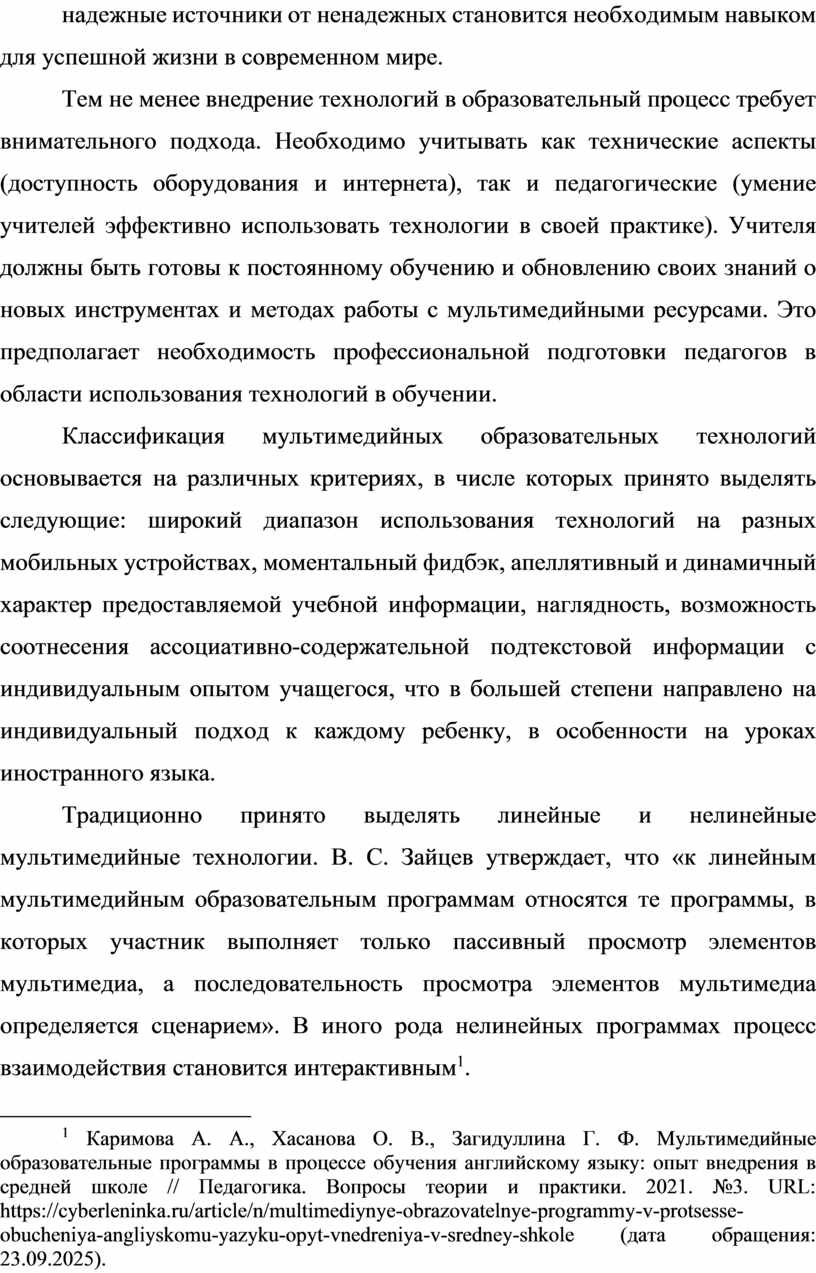 [12] Каримова А. А., Хасанова О. В., Загидуллина Г. Ф. Мультимедийные образовательные программы в процессе обучения английскому языку: опыт внедрения в средней школе // Педагогика. Вопросы теории и практики. 2021. №3. URL: https://cyberleninka.ru/article/n/multimediynye-obrazovatelnye-programmy-v-protsesse-obucheniya-angliyskomu-yazyku-opyt-vnedreniya-v-sredney-shkole (дата обращения: 23.09.2025).