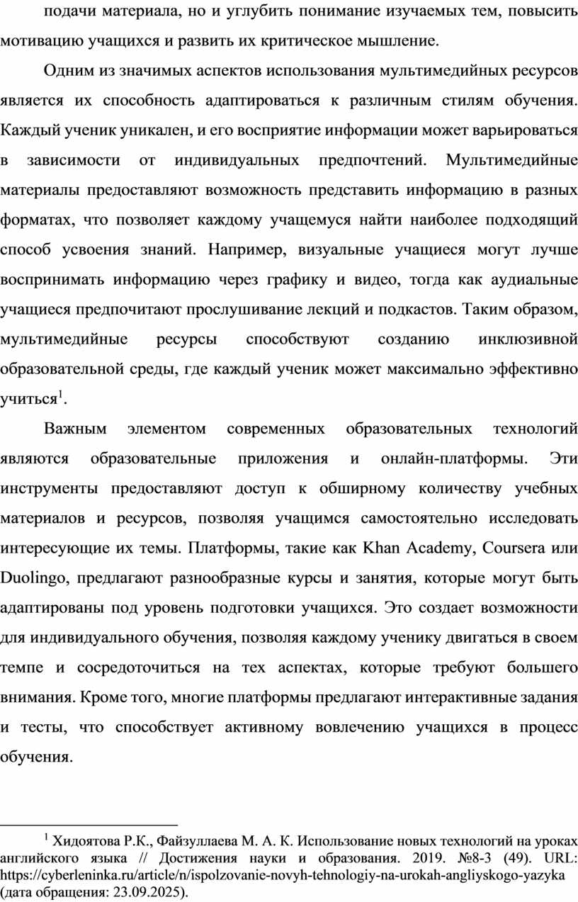 12. Каримова А. А., Хасанова О. В., Загидуллина Г. Ф. Мультимедийные образовательные программы в процессе обучения английскому языку: опыт внедрения в средней школе // Педагогика. Вопросы теории и практики. 2021. №3. URL: https://cyberleninka.ru/article/n/multimediynye-obrazovatelnye-programmy-v-protsesse-obucheniya-angliyskomu-yazyku-opyt-vnedreniya-v-sredney-shkole (дата обращения: 23.09.2025).