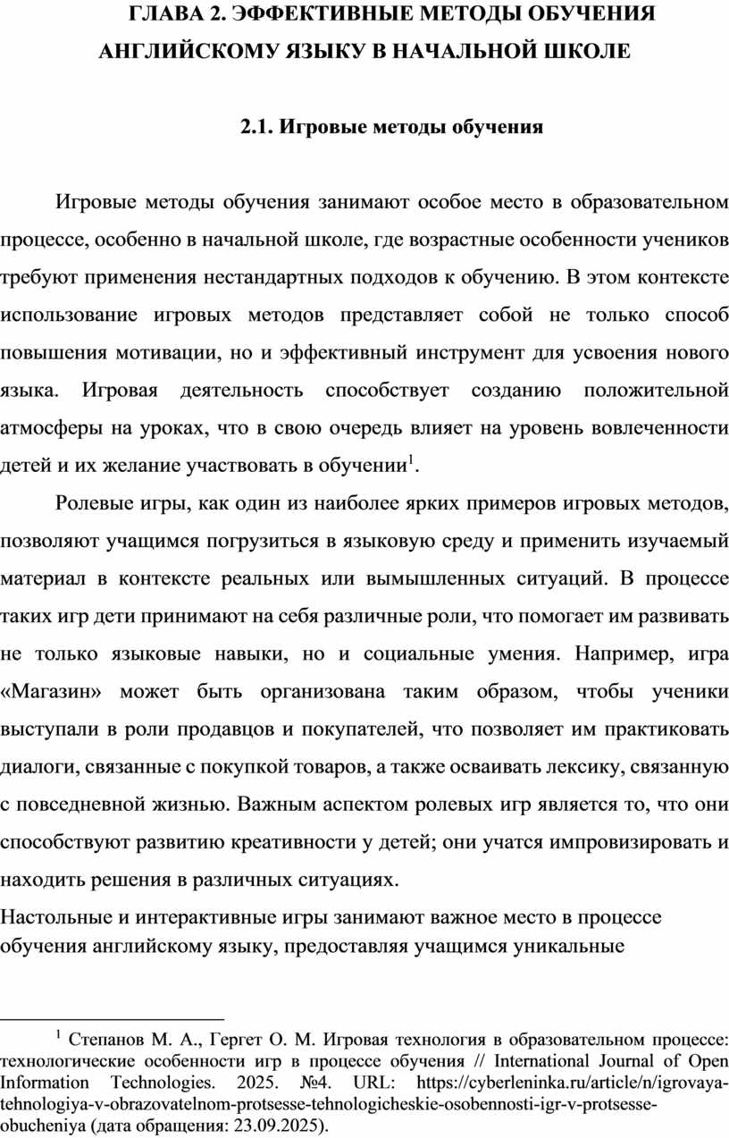 [6] Степанов М. А., Гергет О. М. Игровая технология в образовательном процессе: технологические особенности игр в процессе обучения // International Journal of Open Information Technologies. 2025. №4. URL: https://cyberleninka.ru/article/n/igrovaya-tehnologiya-v-obrazovatelnom-protsesse-tehnologicheskie-osobennosti-igr-v-protsesse-obucheniya (дата обращения: 23.09.2025).