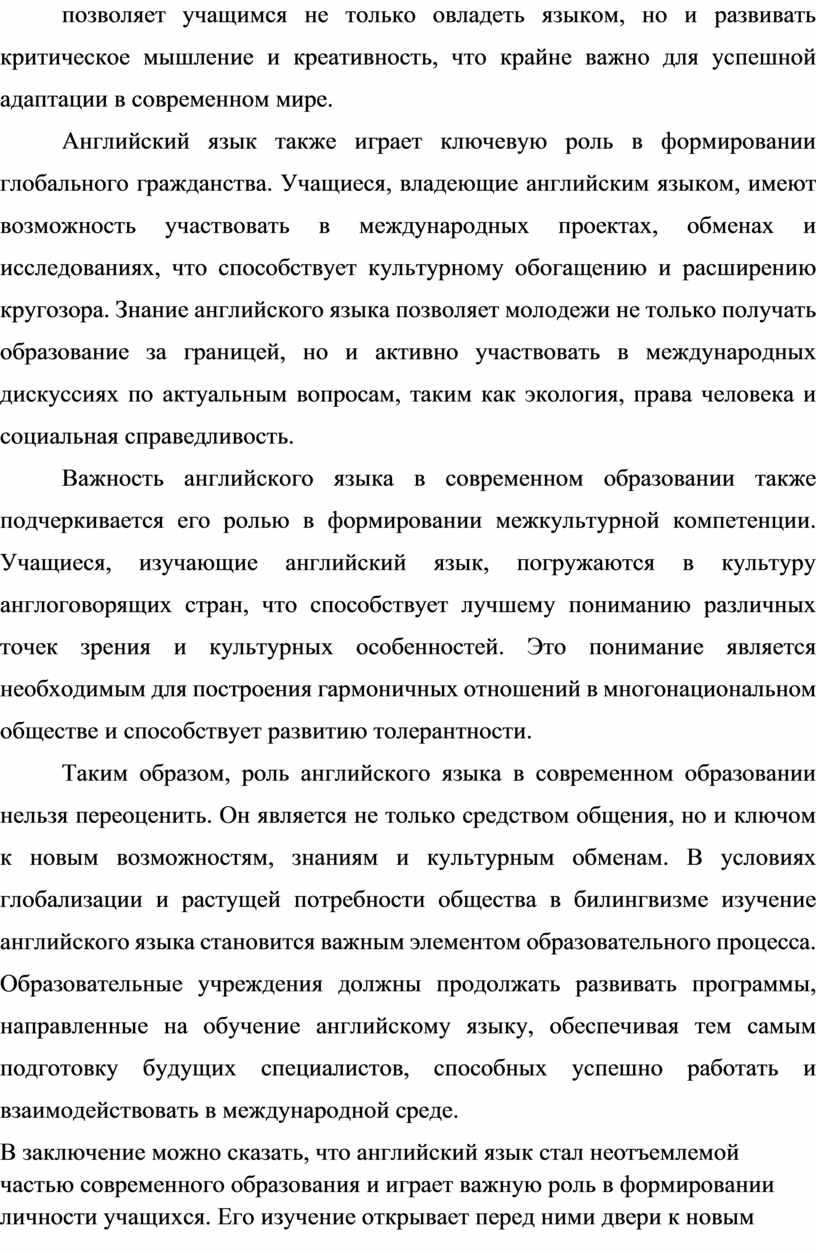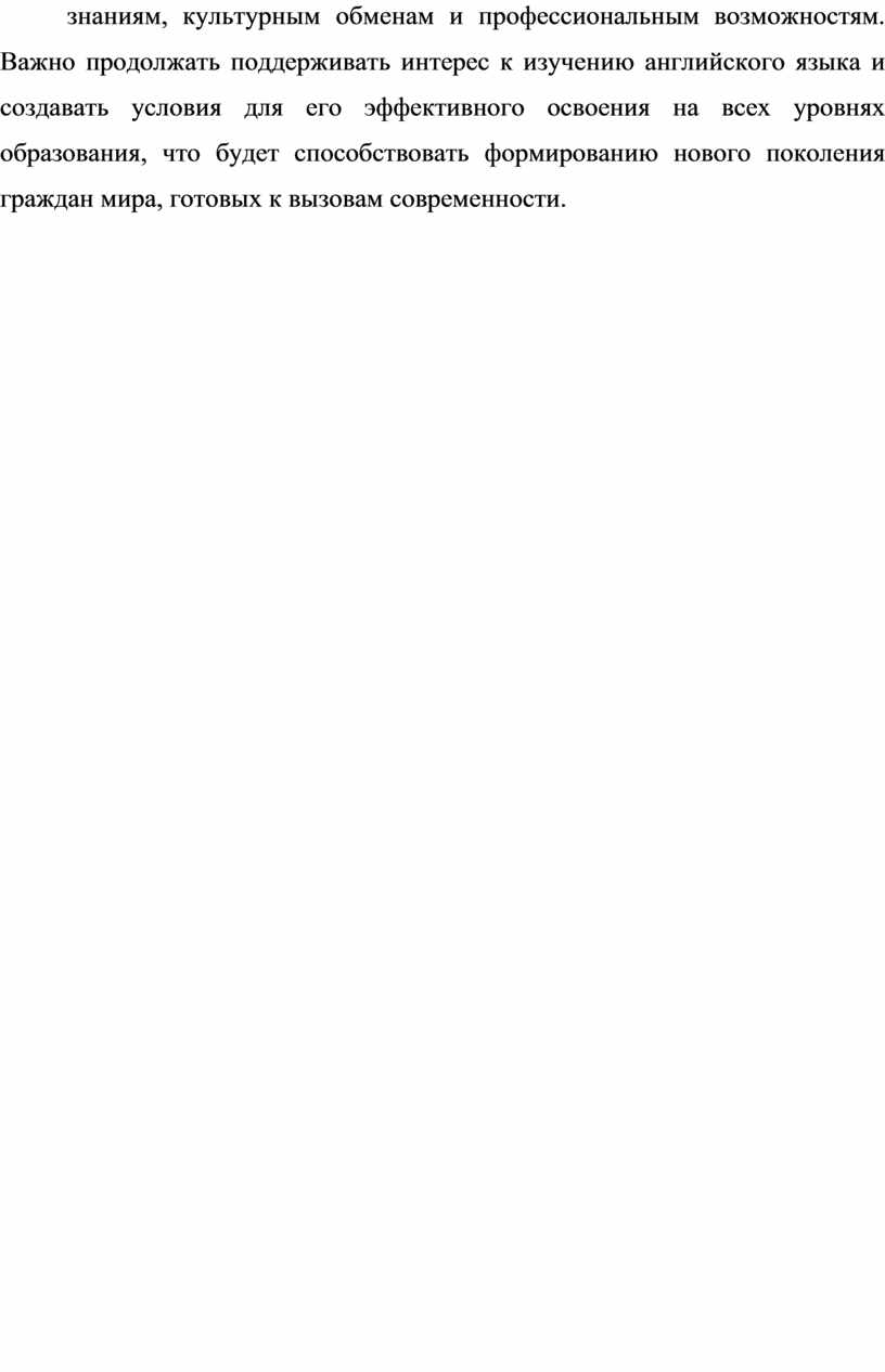 В заключение можно сказать, что английский язык стал неотъемлемой частью современного образования и играет важную роль в формировании личности учащихся. Его изучение открывает перед ними двери к новым знаниям, культурным обменам и профессиональным возможностям. Важно продолжать поддерживать интерес к изучению английского языка и создавать условия для его эффективного освоения на всех уровнях образования, что будет способствовать формированию нового поколения граждан мира, готовых к вызовам современности.