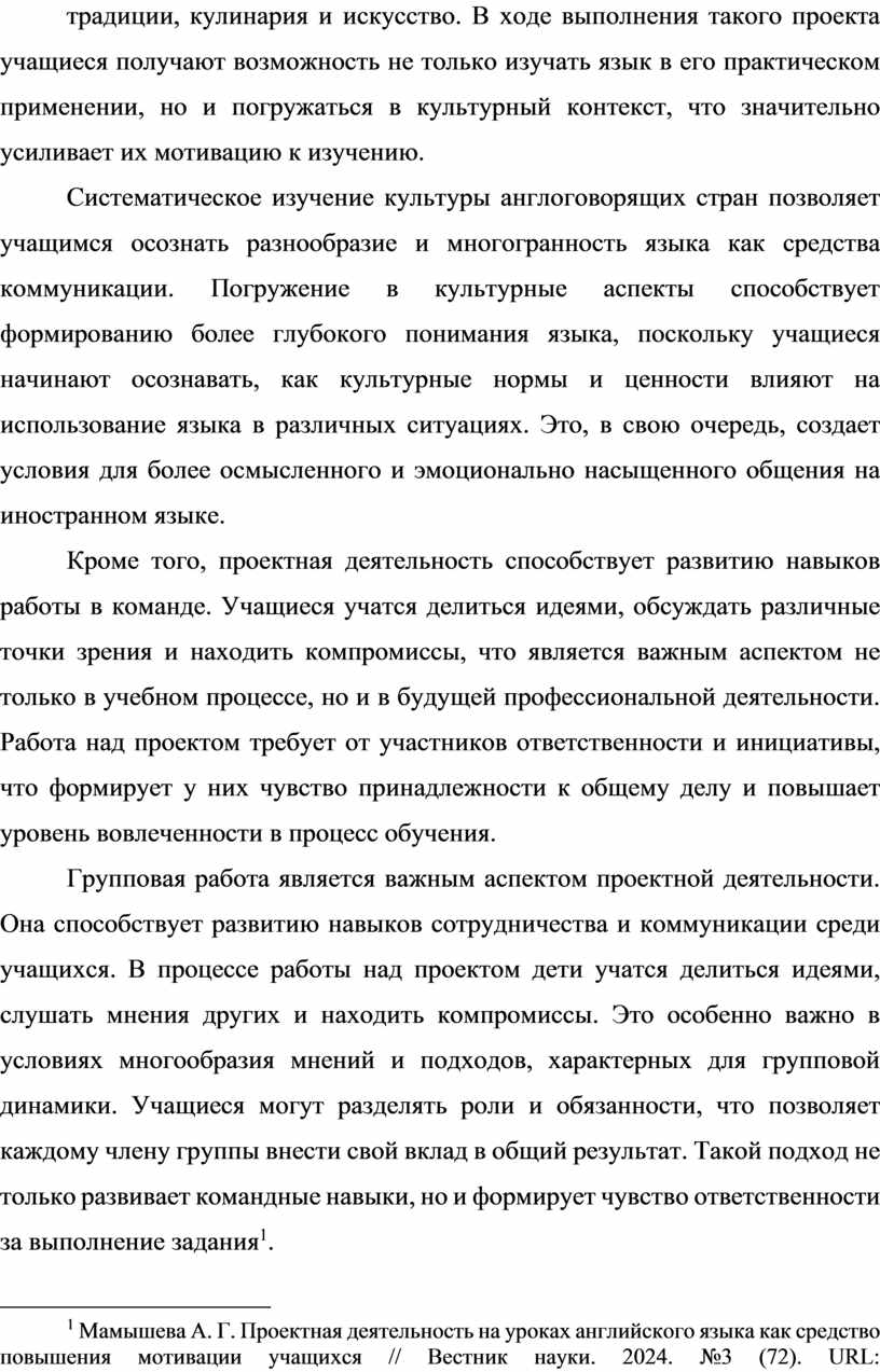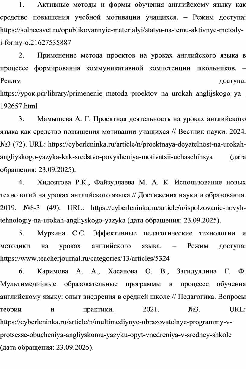 9. Мамышева А. Г. Проектная деятельность на уроках английского языка как средство повышения мотивации учащихся // Вестник науки. 2024. №3 (72). URL: https://cyberleninka.ru/article/n/proektnaya-deyatelnost-na-urokah-angliyskogo-yazyka-kak-sredstvo-povysheniya-motivatsii-uchaschihsya (дата обращения: 23.09.2025).