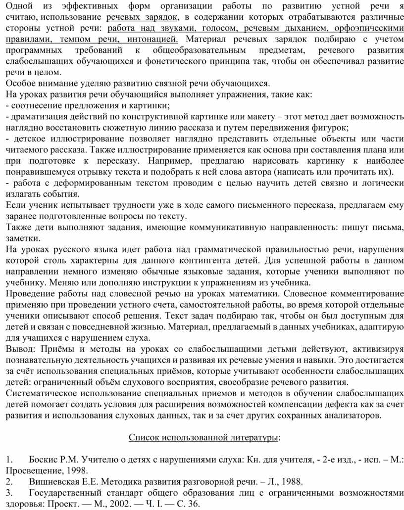 Вывод: Приёмы и методы на уроках со слабослышащими детьми действуют, активизируя познавательную деятельность учащихся и развивая их речевые умения и навыки. Это достигается за счёт использования специальных приёмов, которые учитывают особенности слабослышащих детей: ограниченный объём слухового восприятия, своеобразие речевого развития.
