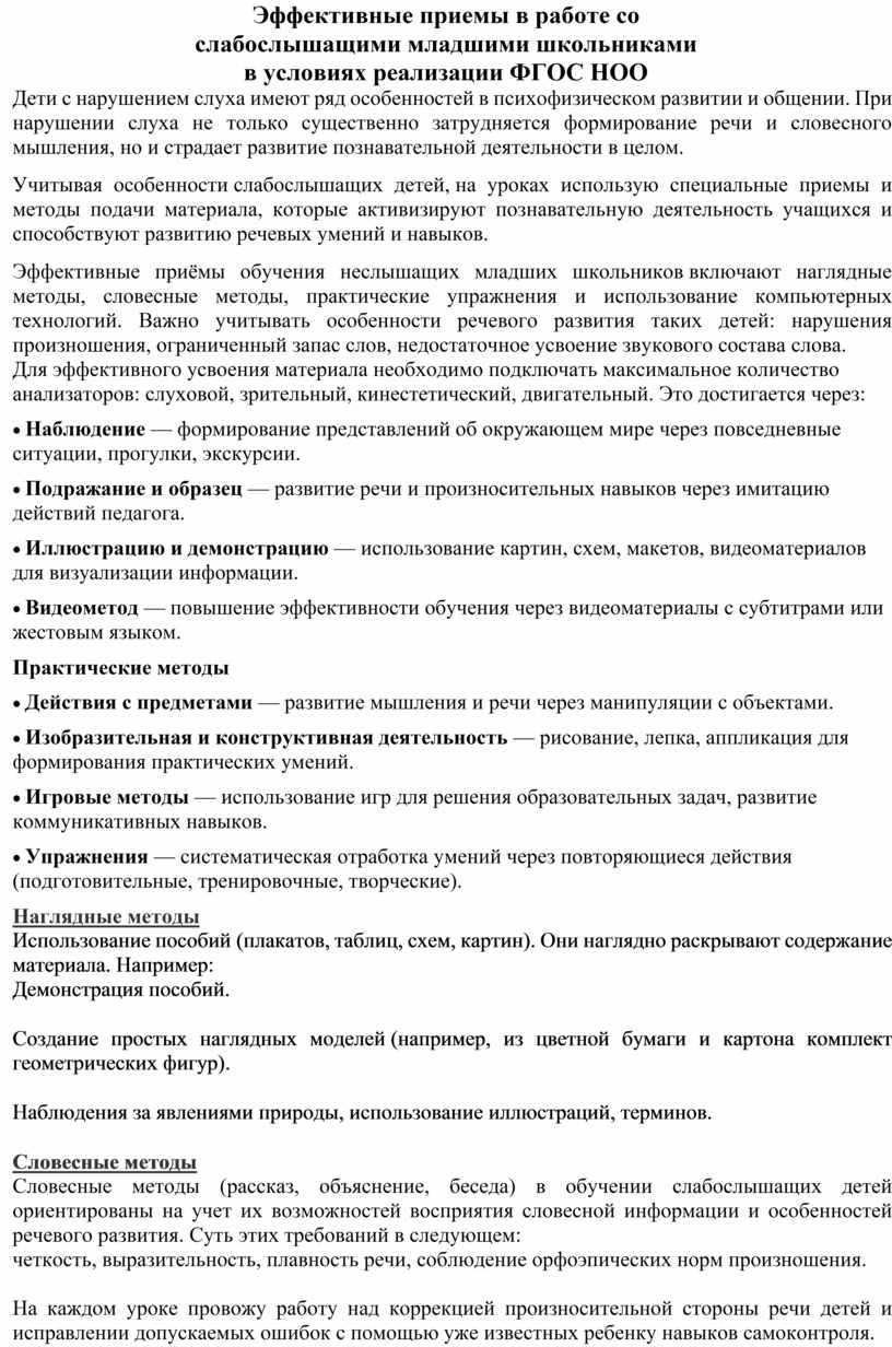 Эффективные приёмы обучения неслышащих младших школьников включают наглядные методы, словесные методы, практические упражнения и использование компьютерных технологий. Важно учитывать особенности речевого развития таких детей: нарушения произношения, ограниченный запас слов, недостаточное усвоение звукового состава слова.
