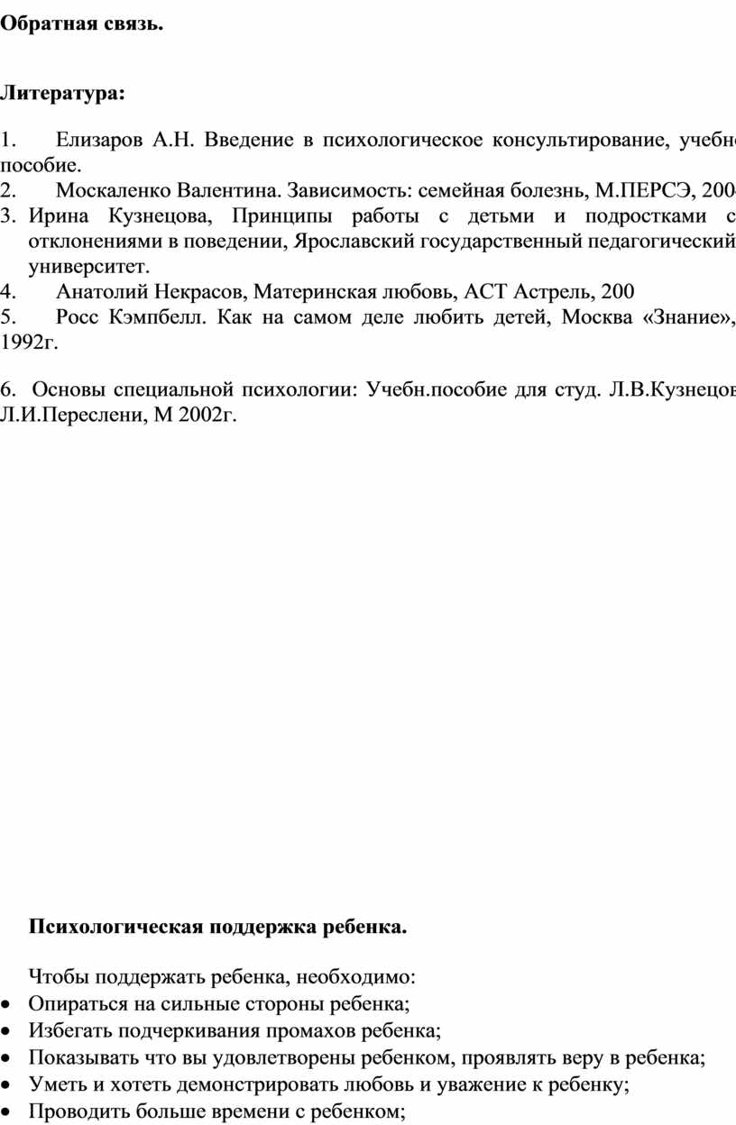 1. Елизаров А.Н. Введение в психологическое консультирование, учебное пособие.