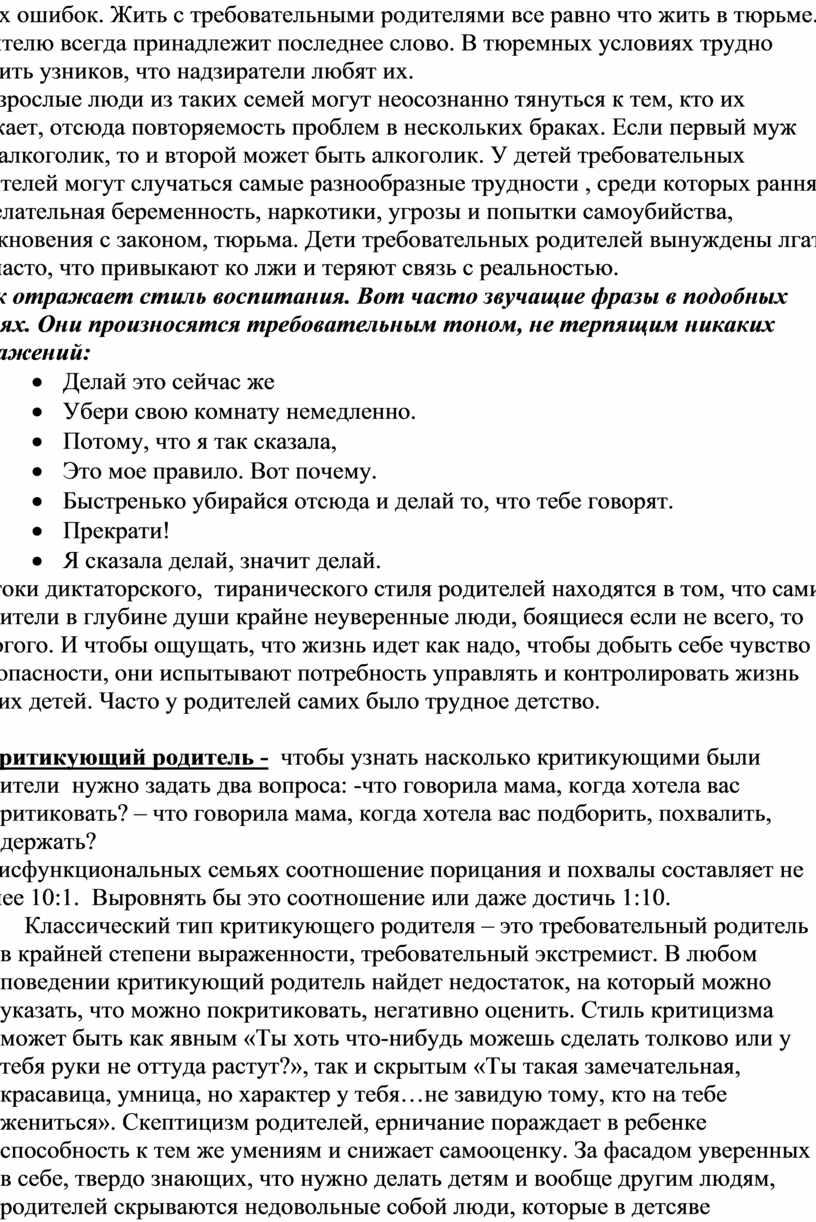 Критикующий родитель - чтобы узнать насколько критикующими были родители нужно задать два вопроса: -что говорила мама, когда хотела вас покритиковать? – что говорила мама, когда хотела вас подборить, похвалить, поддержать?