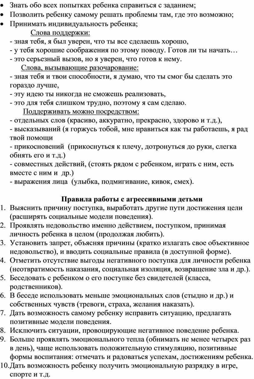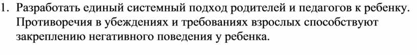 11. Разработать единый системный подход родителей и педагогов к ребенку. Противоречия в убеждениях и требованиях взрослых способствуют закреплению негативного поведения у ребенка.