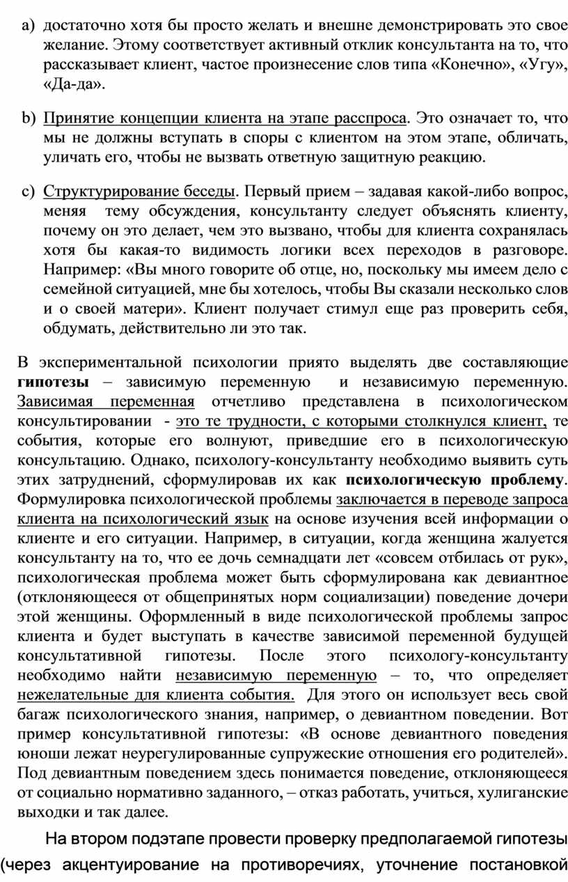 В экспериментальной психологии приято выделять две составляющие гипотезы – зависимую переменную и независимую переменную. Зависимая переменная отчетливо представлена в психологическом консультировании - это те трудности, с которыми столкнулся клиент, те события, которые его волнуют, приведшие его в психологическую консультацию. Однако, психологу-консультанту необходимо выявить суть этих затруднений, сформулировав их как психологическую проблему. Формулировка психологической проблемы заключается в переводе запроса клиента на психологический язык на основе изучения всей информации о клиенте и его ситуации. Например, в ситуации, когда женщина жалуется консультанту на то, что ее дочь семнадцати лет «совсем отбилась от рук», психологическая проблема может быть сформулирована как девиантное (отклоняющееся от общепринятых норм социализации) поведение дочери этой женщины. Оформленный в виде психологической проблемы запрос клиента и будет выступать в качестве зависимой переменной будущей консультативной гипотезы. После этого психологу-консультанту необходимо найти независимую переменную – то, что определяет нежелательные для клиента события. Для этого он использует весь свой багаж психологического знания, например, о девиантном поведении. Вот пример консультативной гипотезы: «В основе девиантного поведения юноши лежат неурегулированные супружеские отношения его родителей». Под девиантным поведением здесь понимается поведение, отклоняющееся от социально нормативно заданного, – отказ работать, учиться, хулиганские выходки и так далее.