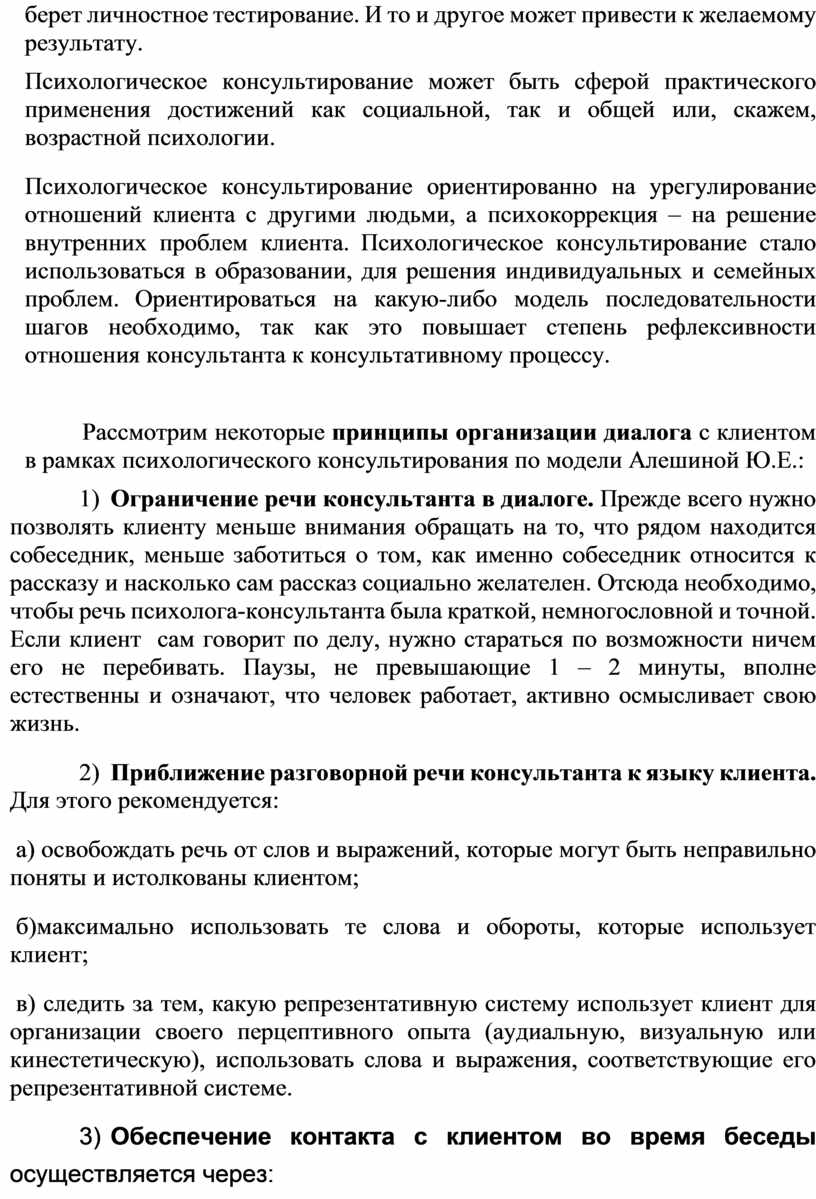 Рассмотрим некоторые принципы организации диалога с клиентом в рамках психологического консультирования по модели Алешиной Ю.Е.: