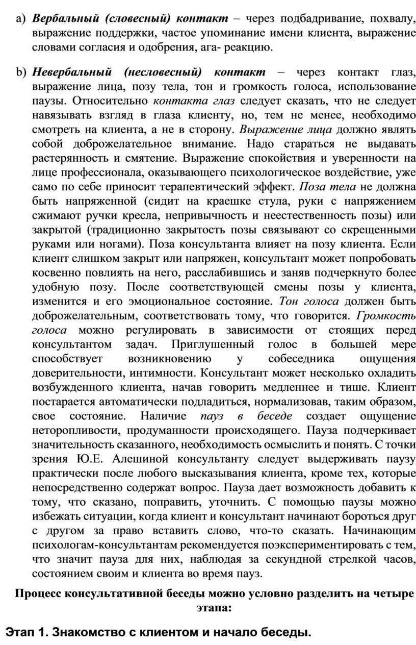 a) Вербальный (словесный) контакт – через подбадривание, похвалу, выражение поддержки, частое упоминание имени клиента, выражение словами согласия и одобрения, ага- реакцию.