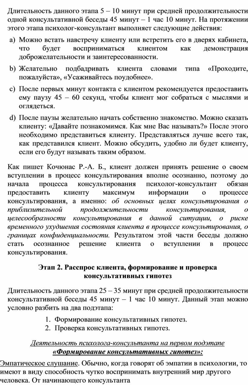 Продолжительность этапа – 5 – 10 минут при средней продолжительности консультативной беседы – 45 минут – 1 час 10 минут. На этом этапе обычно психологом-консультантом выполняются следующие действия: