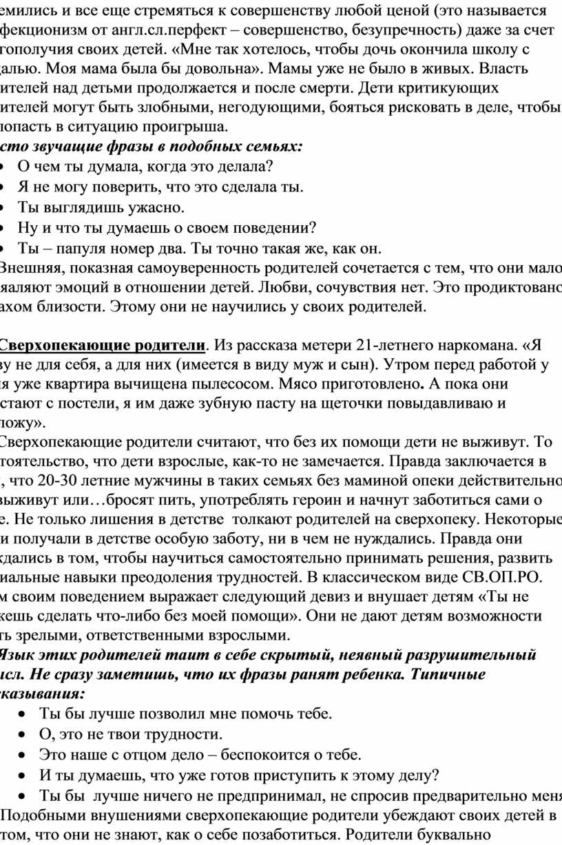 Сверхопекающие родители. Из рассказа метери 21-летнего наркомана. «Я живу не для себя, а для них (имеется в виду муж и сын). Утром перед работой у меня уже квартира вычищена пылесосом. Мясо приготовлено. А пока они повстают с постели, я им даже зубную пасту на щеточки повыдавливаю и разложу».