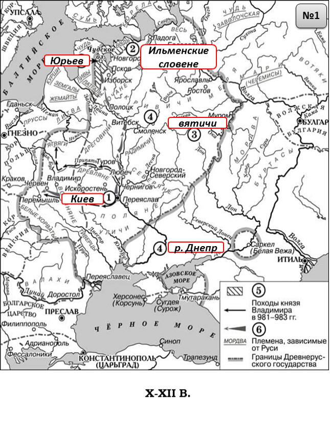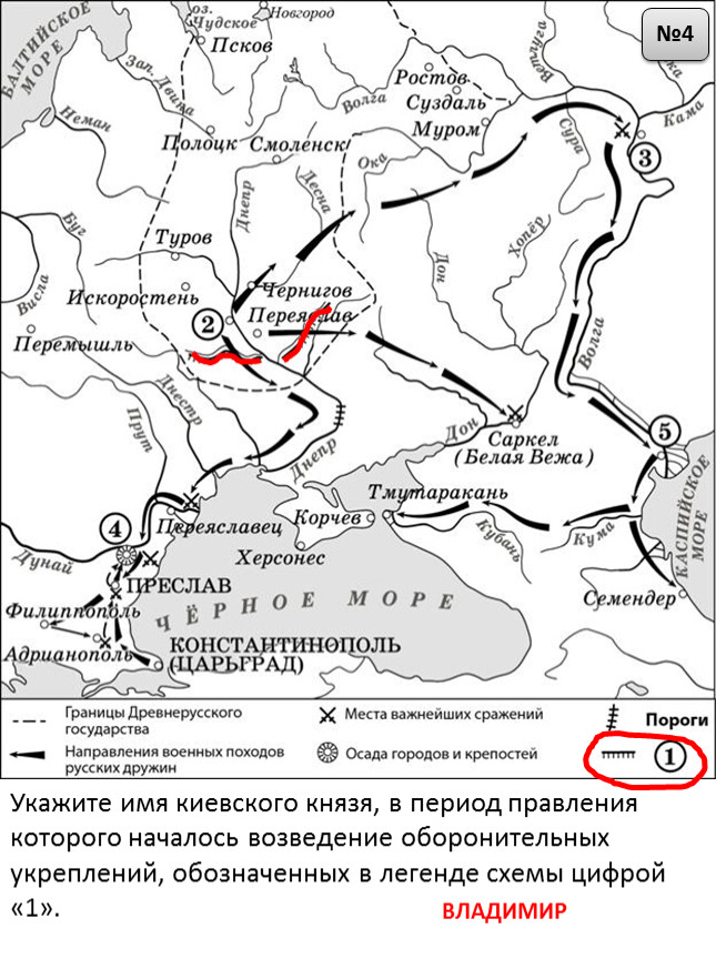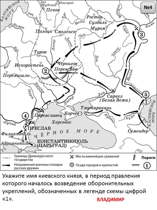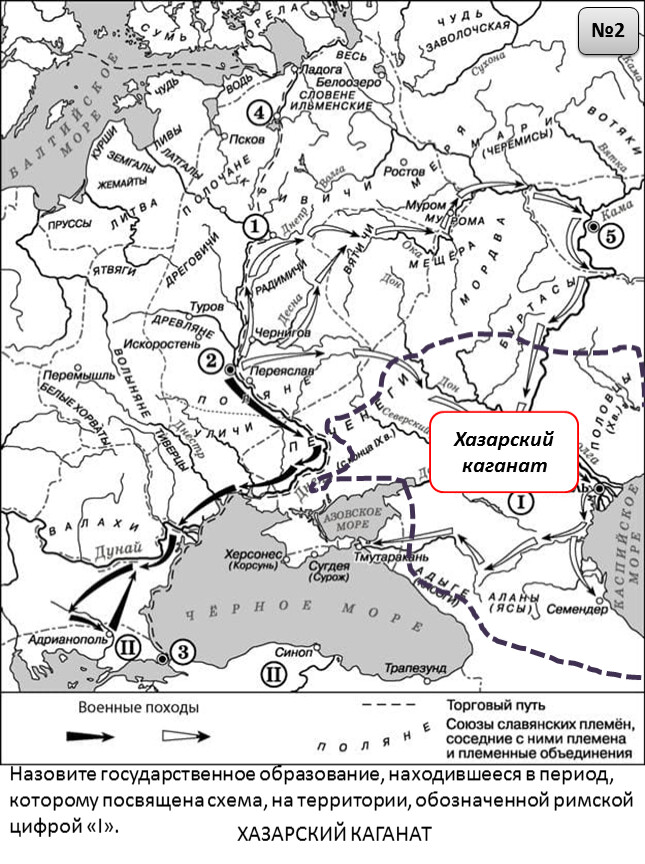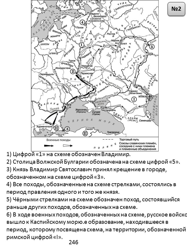1) Цифрой «1» на схеме обозначен Владимир.2) Столица Волжской Булгарии обозначена на схеме цифрой «5».3) Князь Владимир Святославич принял крещение в городе, обозначенном на схеме цифрой «3».4) Все походы, обозначенные на схеме стрелками, состоялись в период правления одного и того же князя.5) Чёрными стрелками на схеме обозначен поход, состоявшийся раньше других походов, обозначенных на схеме.6) В ходе военных походов, обозначенных на схеме, русское войско вышло к Каспийскому морю.е образование, находившееся в период, которому посвящена схема, на территории, обозначенной римской цифрой «I».