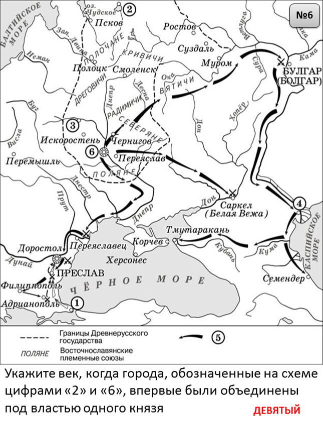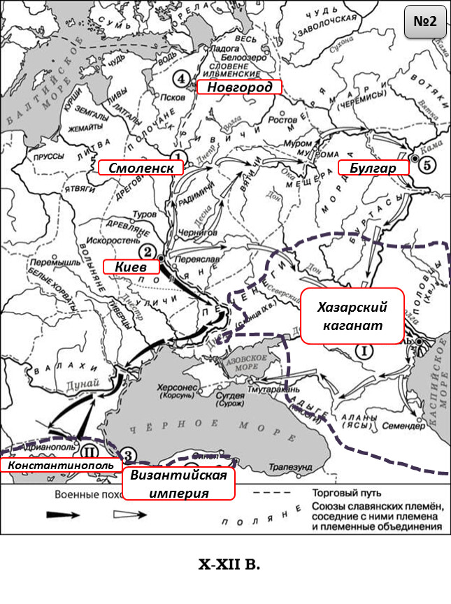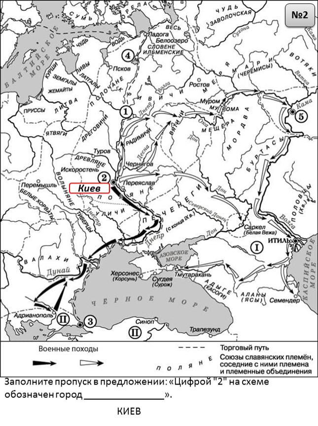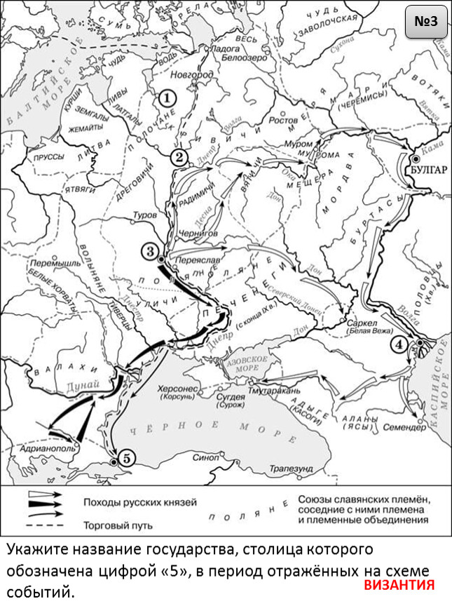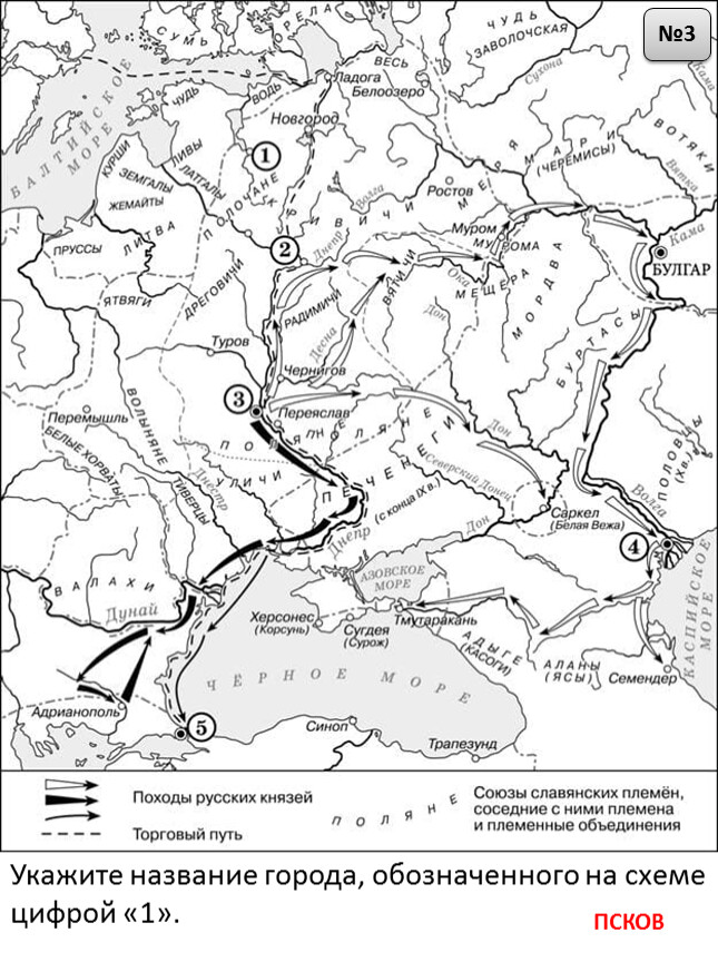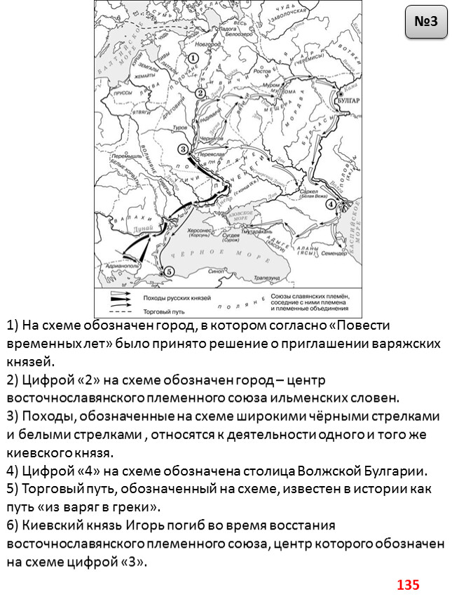 1) На схеме обозначен город, в котором согласно «Повести временных лет» было принято решение о приглашении варяжских князей.2) Цифрой «2» на схеме обозначен город – центр восточнославянского племенного союза ильменских словен.3) Походы, обозначенные на схеме широкими чёрными стрелками и белыми стрелками , относятся к деятельности одного и того же киевского князя.4) Цифрой «4» на схеме обозначена столица Волжской Булгарии.5) Торговый путь, обозначенный на схеме, известен в истории как путь «из варяг в греки».6) Киевский князь Игорь погиб во время восстания восточнославянского племенного союза, центр которого обозначен на схеме цифрой «3».