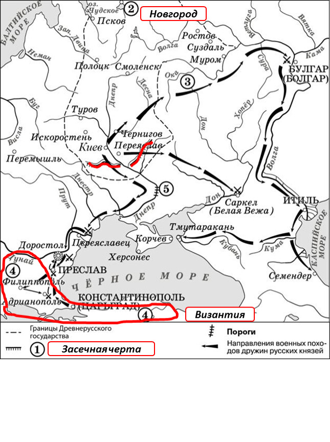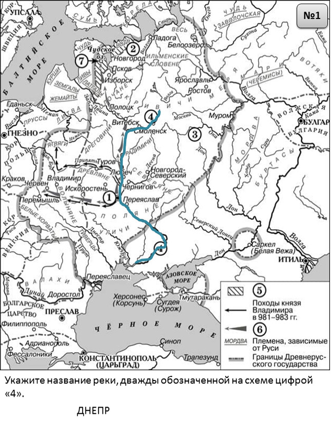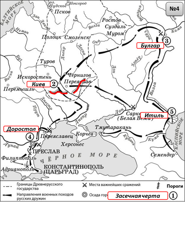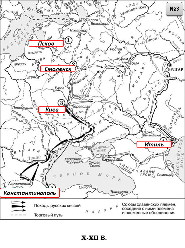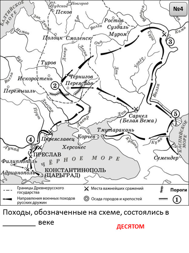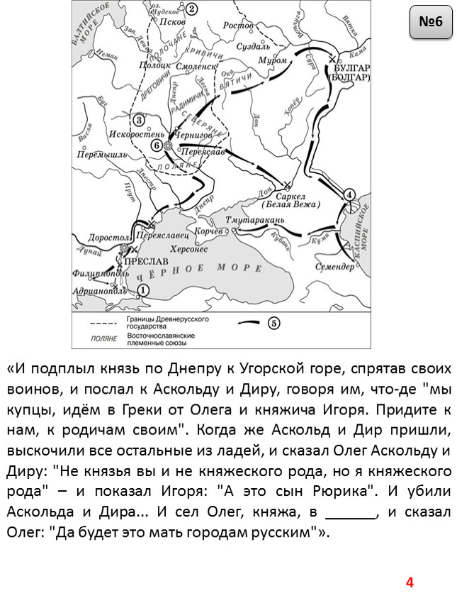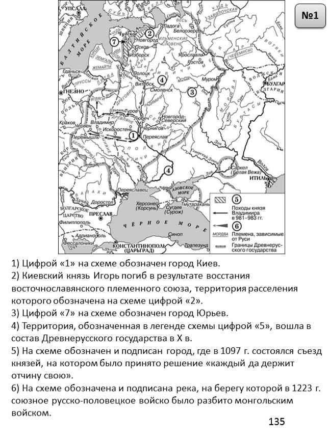 1) На схеме обозначен город, в котором согласно «Повести временных лет» было принято решение о приглашении варяжских князей.2) Цифрой «2» на схеме обозначен город – центр восточнославянского племенного союза ильменских словен.3) Походы, обозначенные на схеме широкими чёрными стрелками и белыми стрелками , относятся к деятельности одного и того же киевского князя.4) Цифрой «4» на схеме обозначена столица Волжской Булгарии.5) Торговый путь, обозначенный на схеме, известен в истории как путь «из варяг в греки».6) Киевский князь Игорь погиб во время восстания восточнославянского племенного союза, центр которого обозначен на схеме цифрой «3».