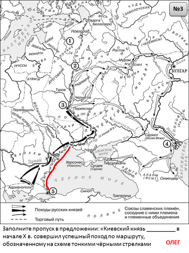 Заполните пропуск в предложении: «Киевский князь _________ в начале X в. совершил успешный поход по маршруту, обозначенному на схеме тонкими чёрными стрелками