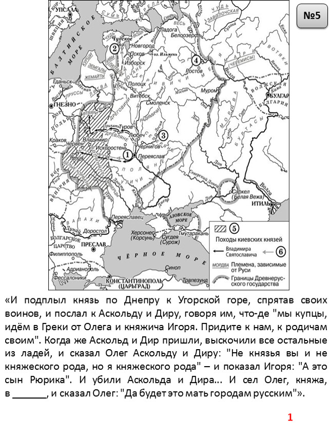 «И подплыл князь по Днепру к Угорской горе, спрятав своих воинов, и послал к Аскольду и Диру, говоря им, что-де "мы купцы, идём в Греки от Олега и княжича Игоря. Придите к нам, к родичам своим". Когда же Аскольд и Дир пришли, выскочили все остальные из ладей, и сказал Олег Аскольду и Диру: "Не князья вы и не княжеского рода, но я княжеского рода" – и показал Игоря: "А это сын Рюрика". И убили Аскольда и Дира... И сел Олег, княжа,в ______, и сказал Олег: "Да будет это мать городам русским"».