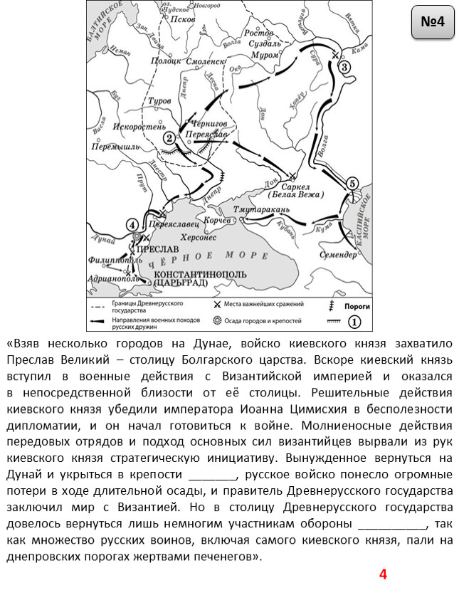 «Взяв несколько городов на Дунае, войско киевского князя захватило Преслав Великий – столицу Болгарского царства. Вскоре киевский князь вступил в военные действия с Византийской империей и оказалсяв непосредственной близости от её столицы. Решительные действия киевского князя убедили императора Иоанна Цимисхия в бесполезности дипломатии, и он начал готовиться к войне. Молниеносные действия передовых отрядов и подход основных сил византийцев вырвали из рук киевского князя стратегическую инициативу. Вынужденное вернуться на Дунай и укрыться в крепости _______, русское войско понесло огромные потери в ходе длительной осады, и правитель Древнерусского государства заключил мир с Византией. Но в столицу Древнерусского государства довелось вернуться лишь немногим участникам обороны __________, так как множество русских воинов, включая самого киевского князя, пали на днепровских порогах жертвами печенегов».
