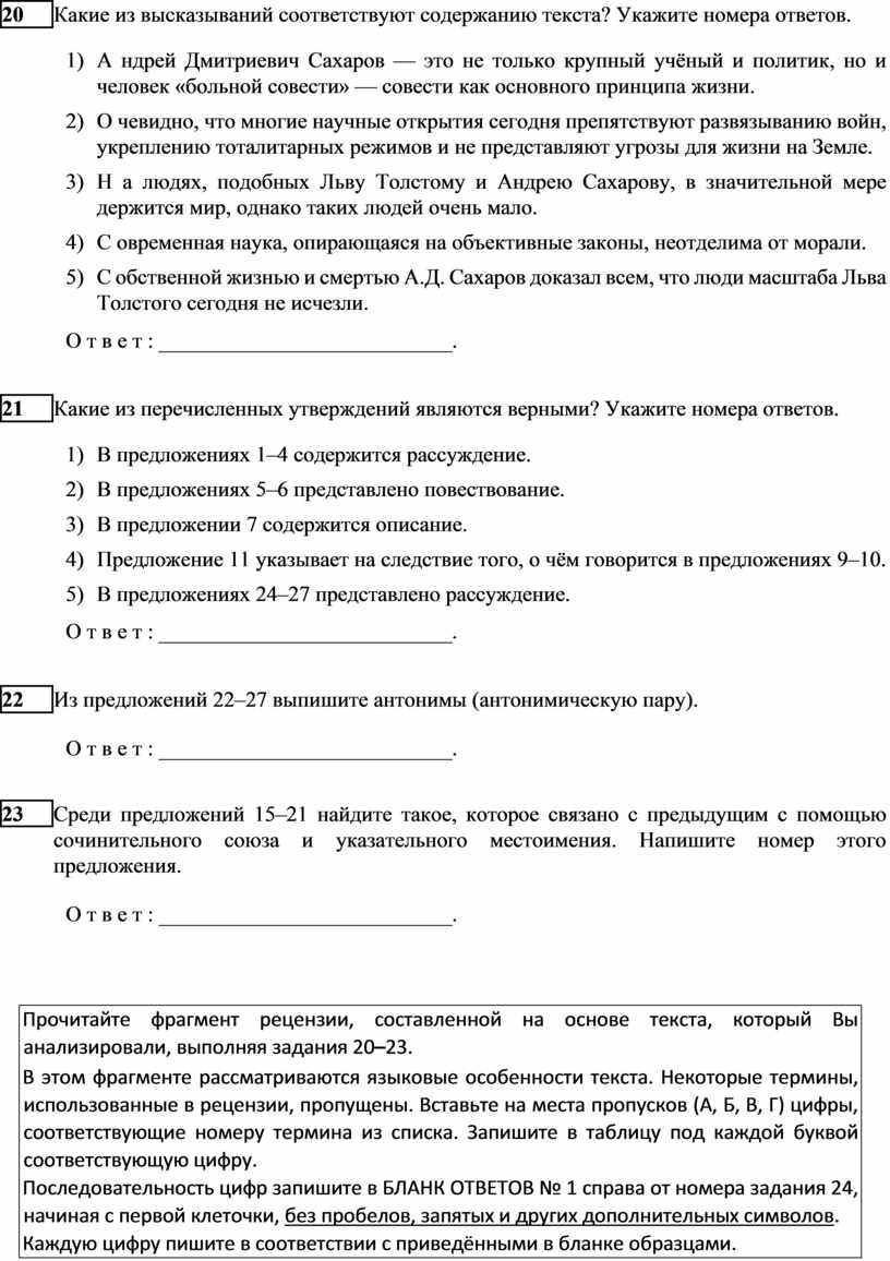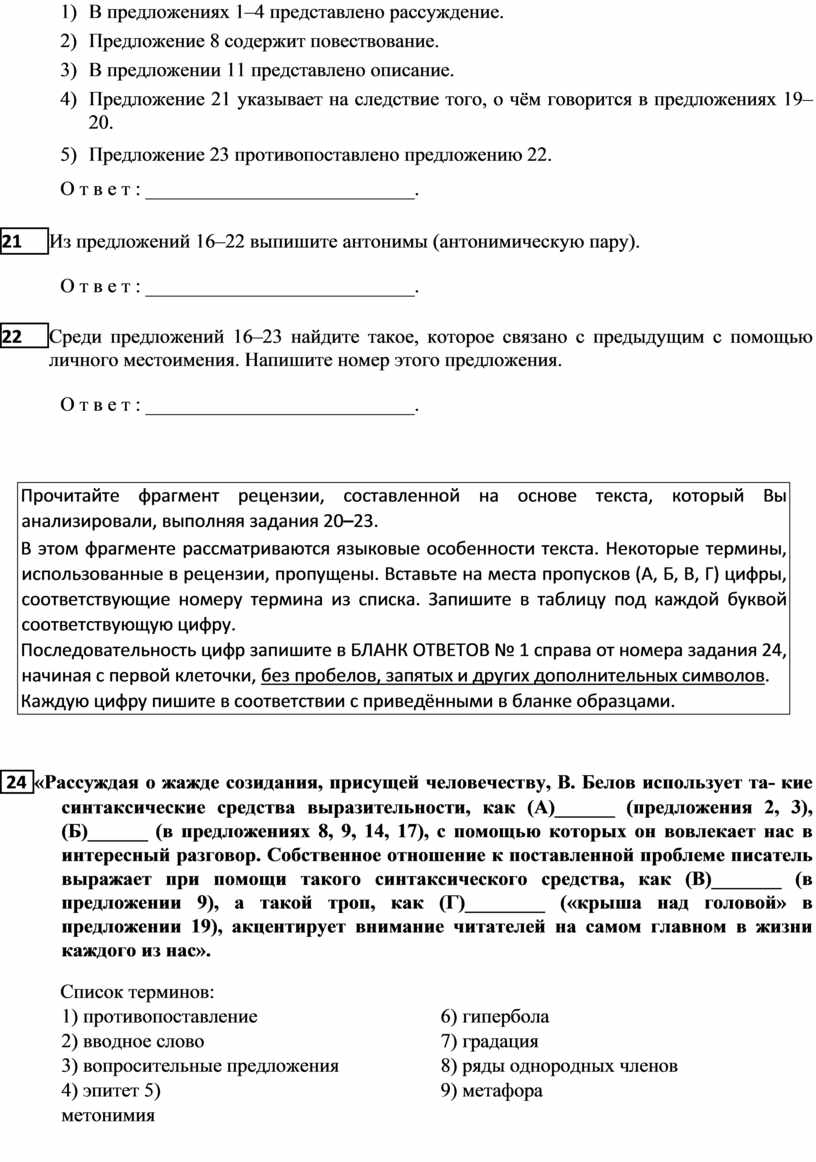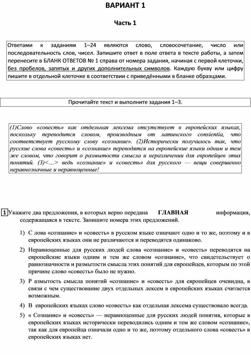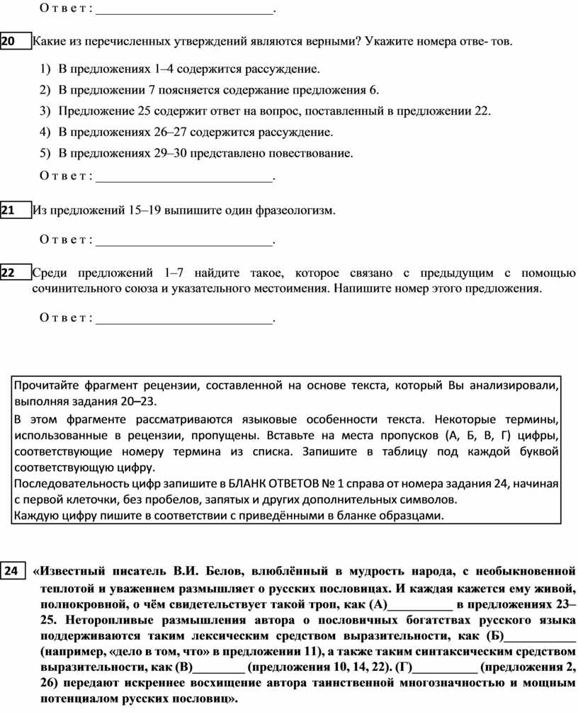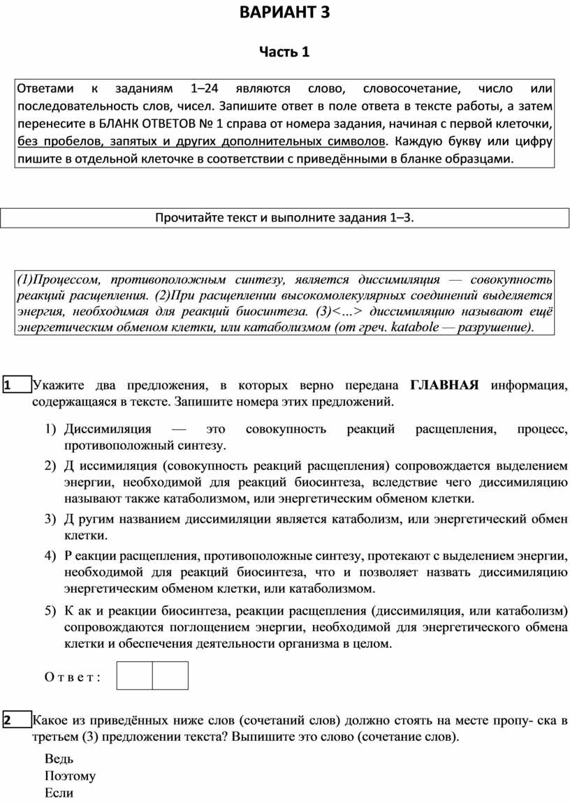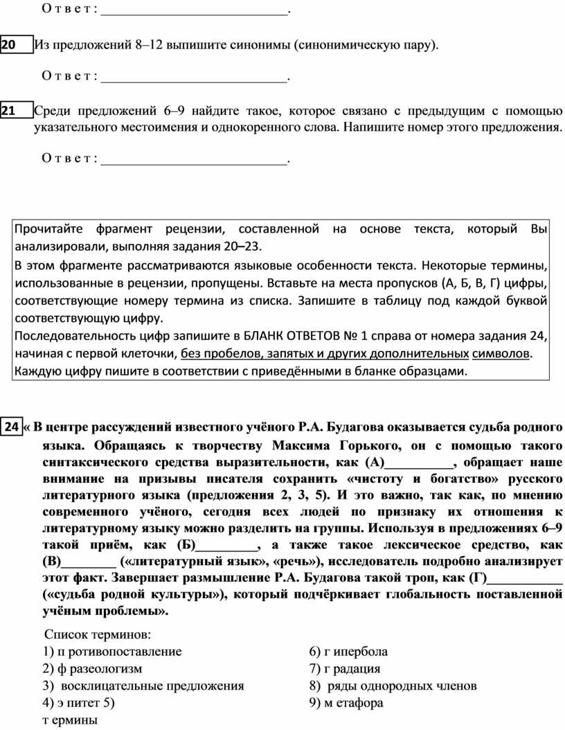 Ответами к заданиям 1–24 являются слово, словосочетание, число или последовательность слов, чисел. Запишите ответ в поле ответа в тексте работы, а затем перенесите в БЛАНК ОТВЕТОВ № 1 справа от номера задания, начиная с первой клеточки, без пробелов, запятых и других дополнительных символов. Каждую букву или цифру пишите в отдельной клеточке в соответствии с приведёнными в бланке образцами.
