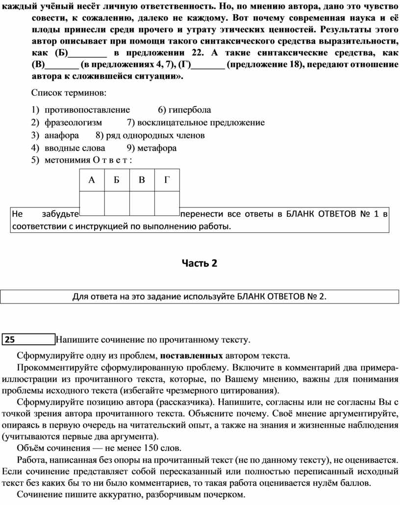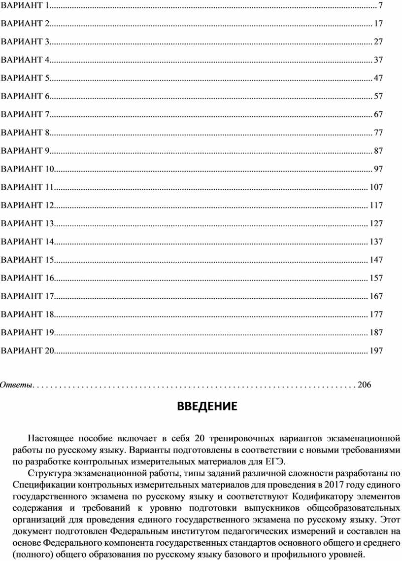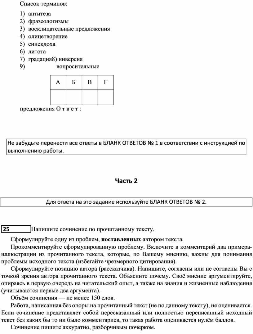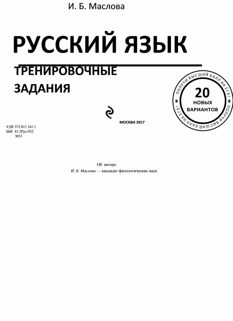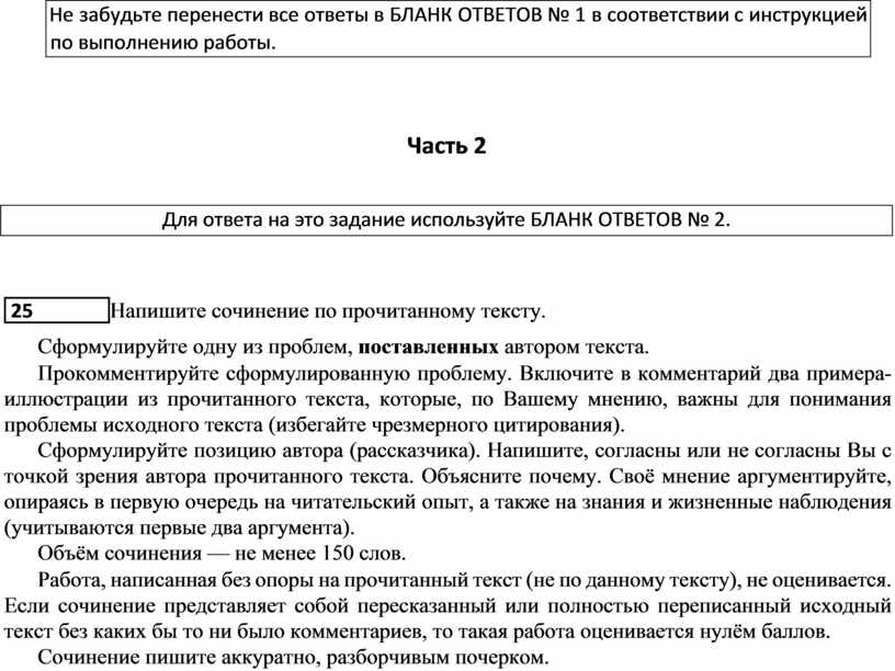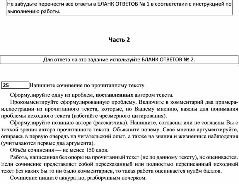 Каждый тренировочный вариант состоит из двух частей и содержит 25 заданий. Часть 1 содержит 24 задания, часть 2 содержит одно задание. На выполнение экзаменационной работы по русскому языку отводится 3,5 часа (210 минут). Ответами к заданиям 1–24 являются цифра (число) или слово (несколько слов), последовательность цифр (чисел). Ответы необходимо записывать в поле ответа в тексте работы, а затем переносить в бланк ответов № 1. Задание 25 части 2 представляет собой сочинение по прочитанному тексту. Это задание выполняется на бланке ответов № 2. Образцы бланков ответов № 1 и № 2 размещены перед тренировочными вариантами. В конце книги приводятся ответы на все задания.