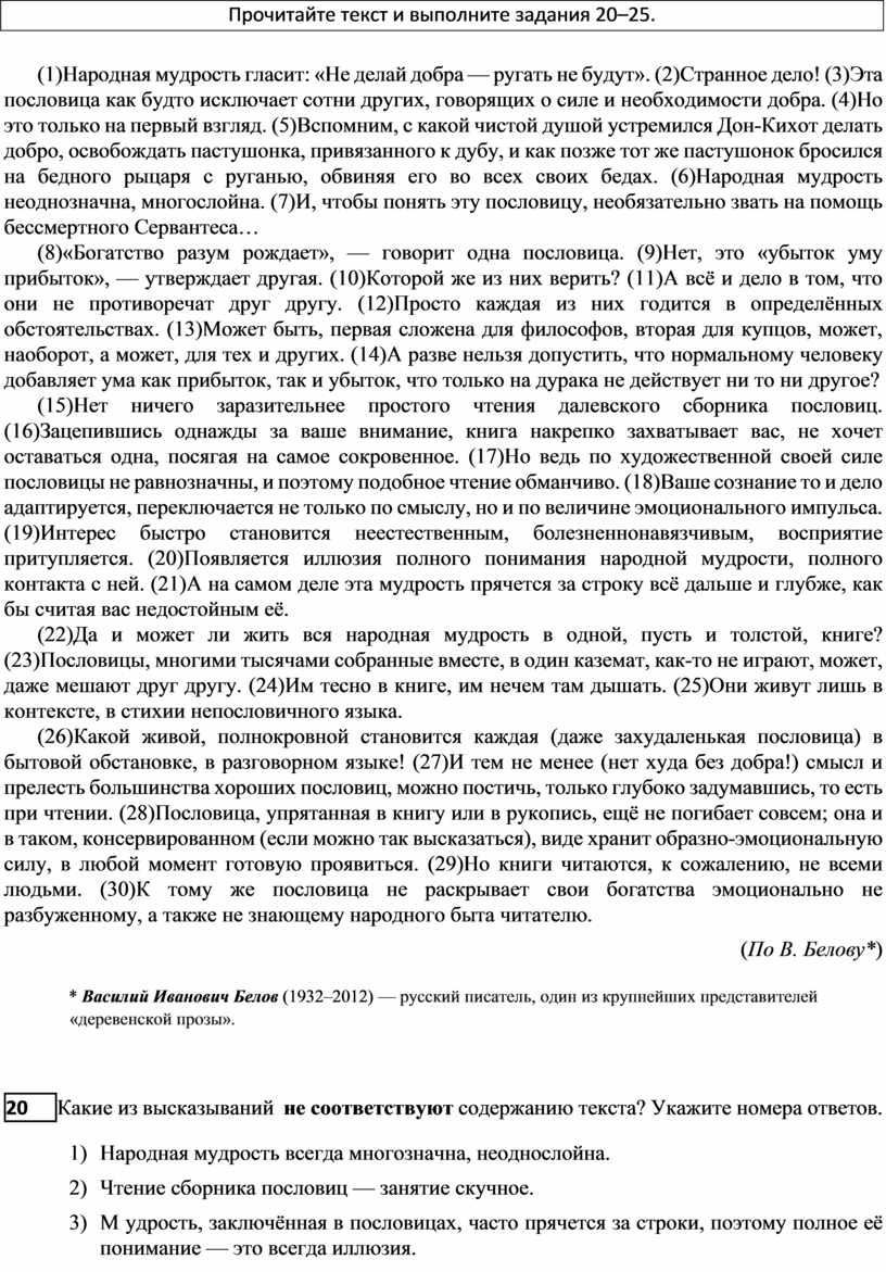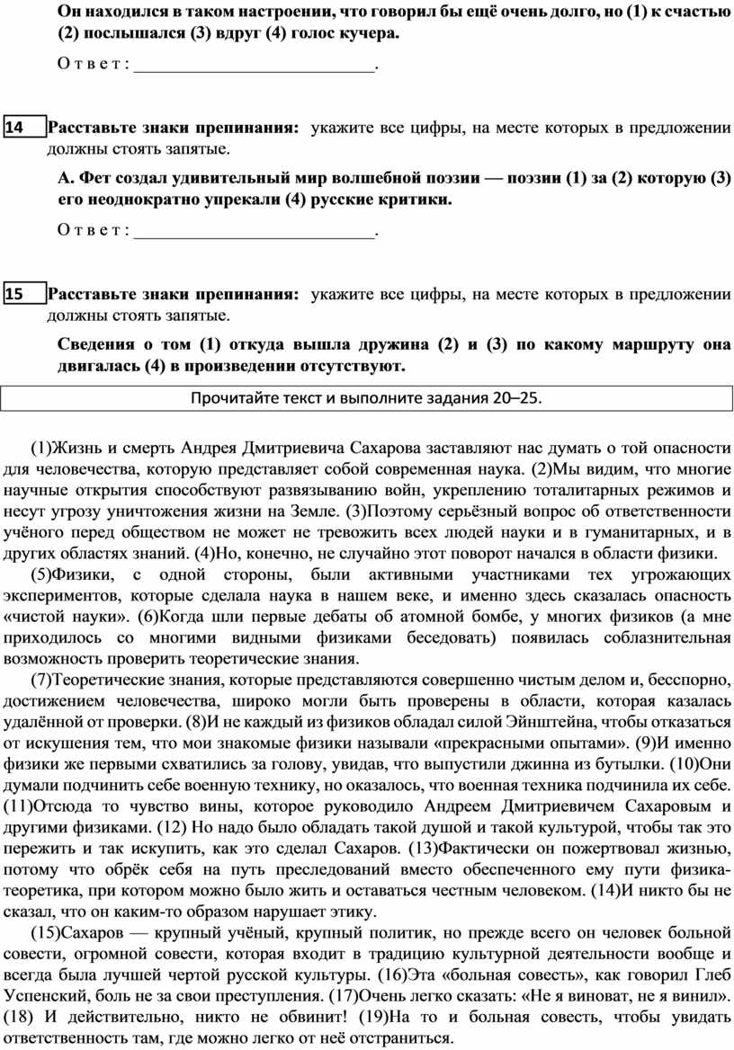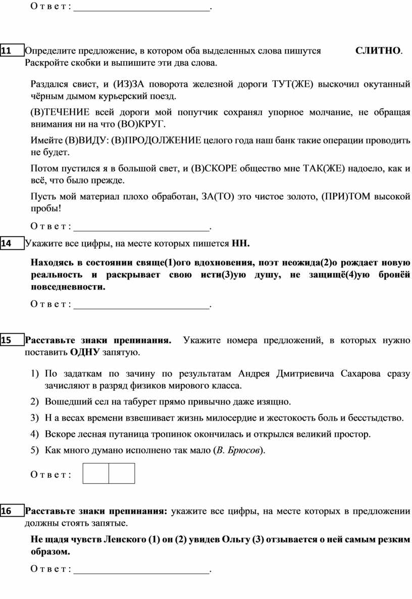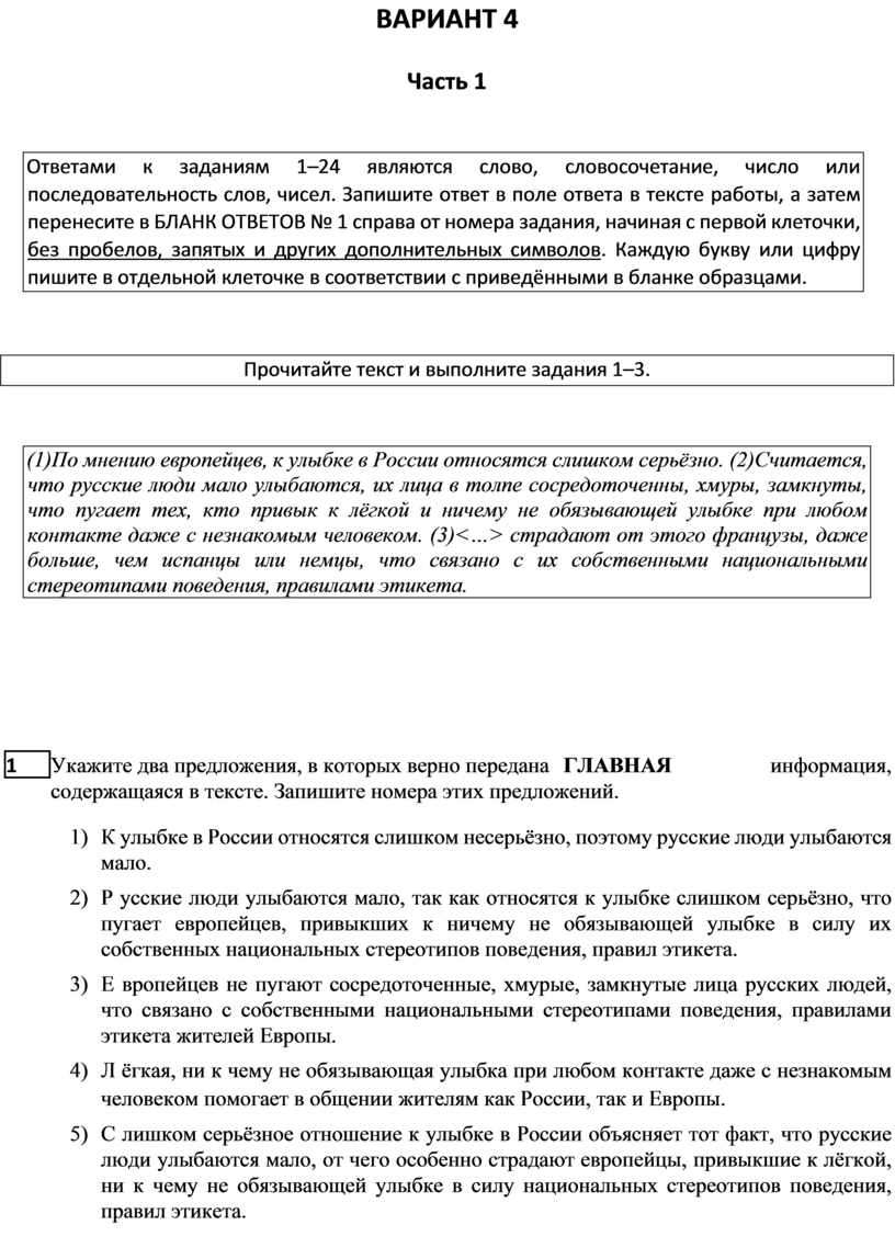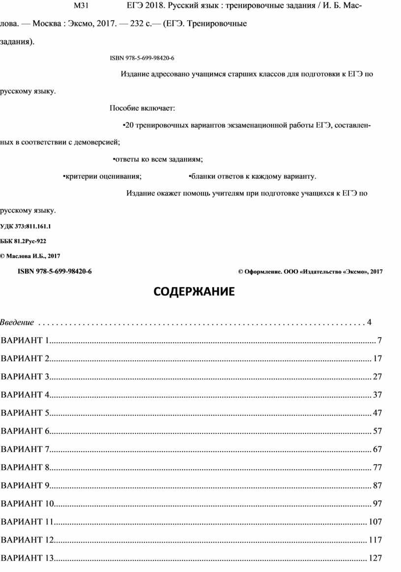 Каждый тренировочный вариант состоит из двух частей и содержит 25 заданий. Часть 1 содержит 24 задания, часть 2 содержит одно задание. На выполнение экзаменационной работы по русскому языку отводится 3,5 часа (210 минут). Ответами к заданиям 1–24 являются цифра (число) или слово (несколько слов), последовательность цифр (чисел). Ответы необходимо записывать в поле ответа в тексте работы, а затем переносить в бланк ответов № 1. Задание 25 части 2 представляет собой сочинение по прочитанному тексту. Это задание выполняется на бланке ответов № 2. Образцы бланков ответов № 1 и № 2 размещены перед тренировочными вариантами. В конце книги приводятся ответы на все задания.