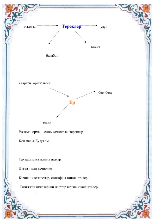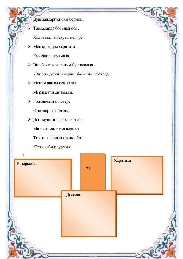 1) Тахтада аталар сезлери язылгъан. Нокъталар ерине керекли арифлерни