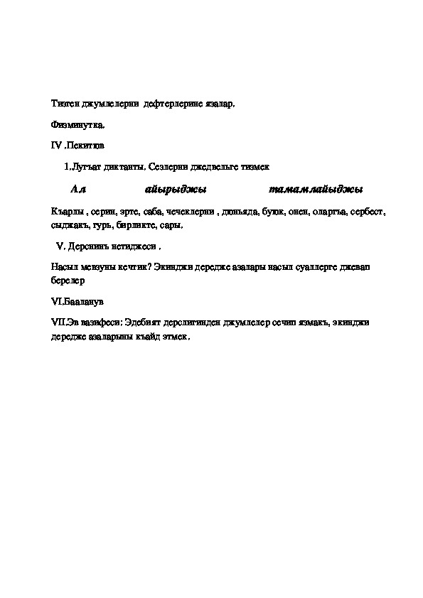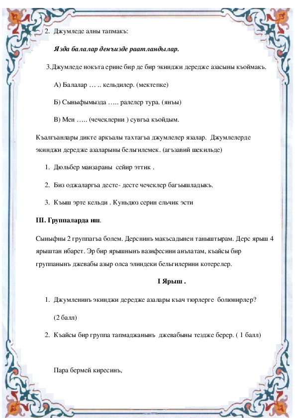 1) Берильген сезлерден догъру джумле тизмек, экинджи дередже азаларны