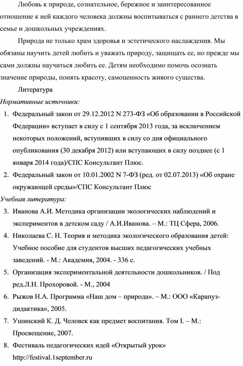 3. Иванова А.И. Методика организации экологических наблюдений и экспериментов в детском саду / А.И.Иванова. – М.: ТЦ Сфера, 2006.