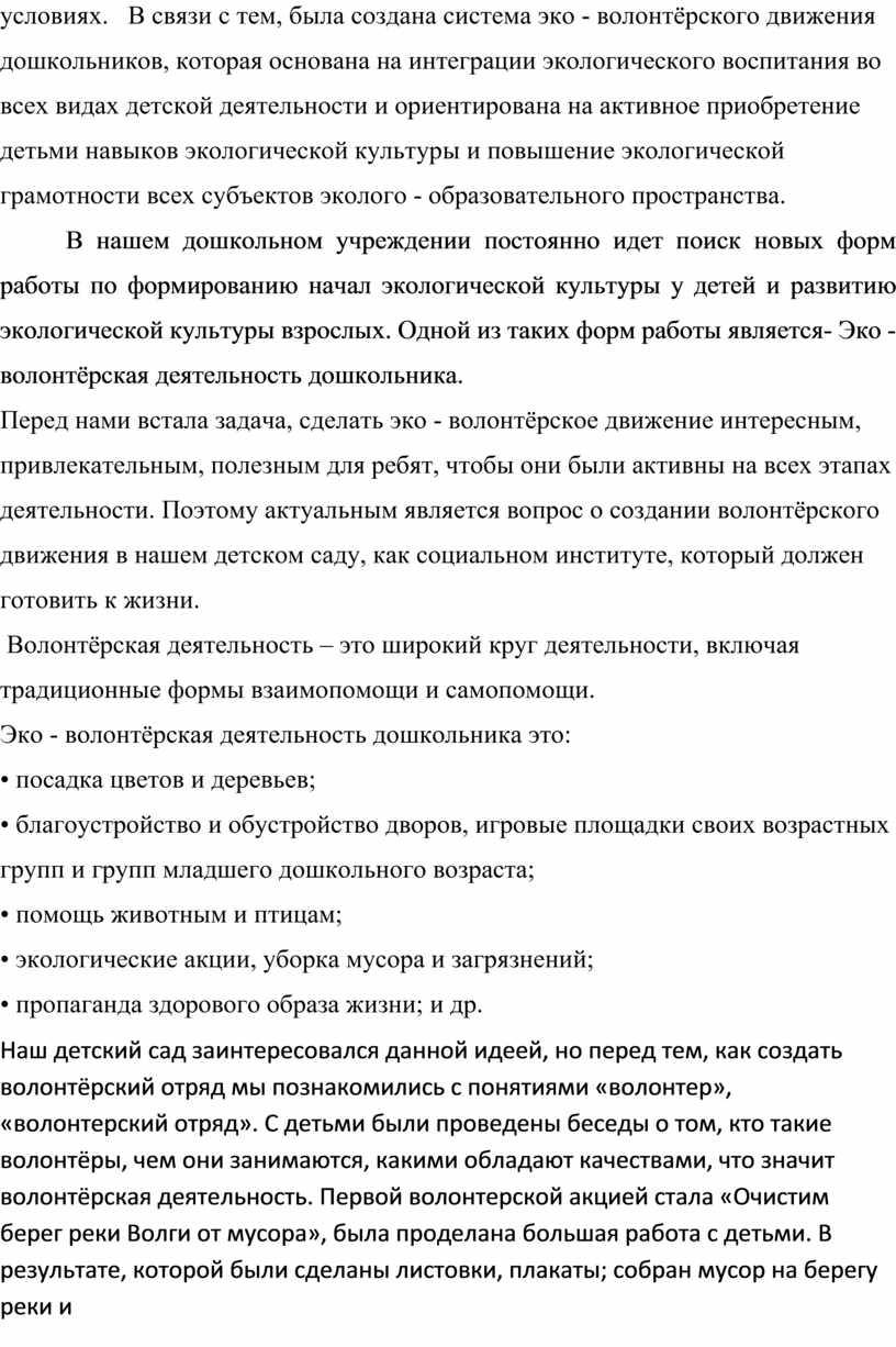Дети дошкольного возраста чрезвычайно чувствительны к разного рода воздействиям. Ребенок дошкольного возраста, как губка впитывает впечатления, знания, стили поведения воспитателя, работающего с ним. Эколого-социальная ситуация сегодняшнего дня выдвигает перед воспитателями дошкольного образования задачу поиска универсальных средств, методов и приемов экологического воспитания в современных условиях. В связи с тем, была создана система эко - волонтёрского движения дошкольников, которая основана на интеграции экологического воспитания во всех видах детской деятельности и ориентирована на активное приобретение детьми навыков экологической культуры и повышение экологической грамотности всех субъектов эколого - образовательного пространства.