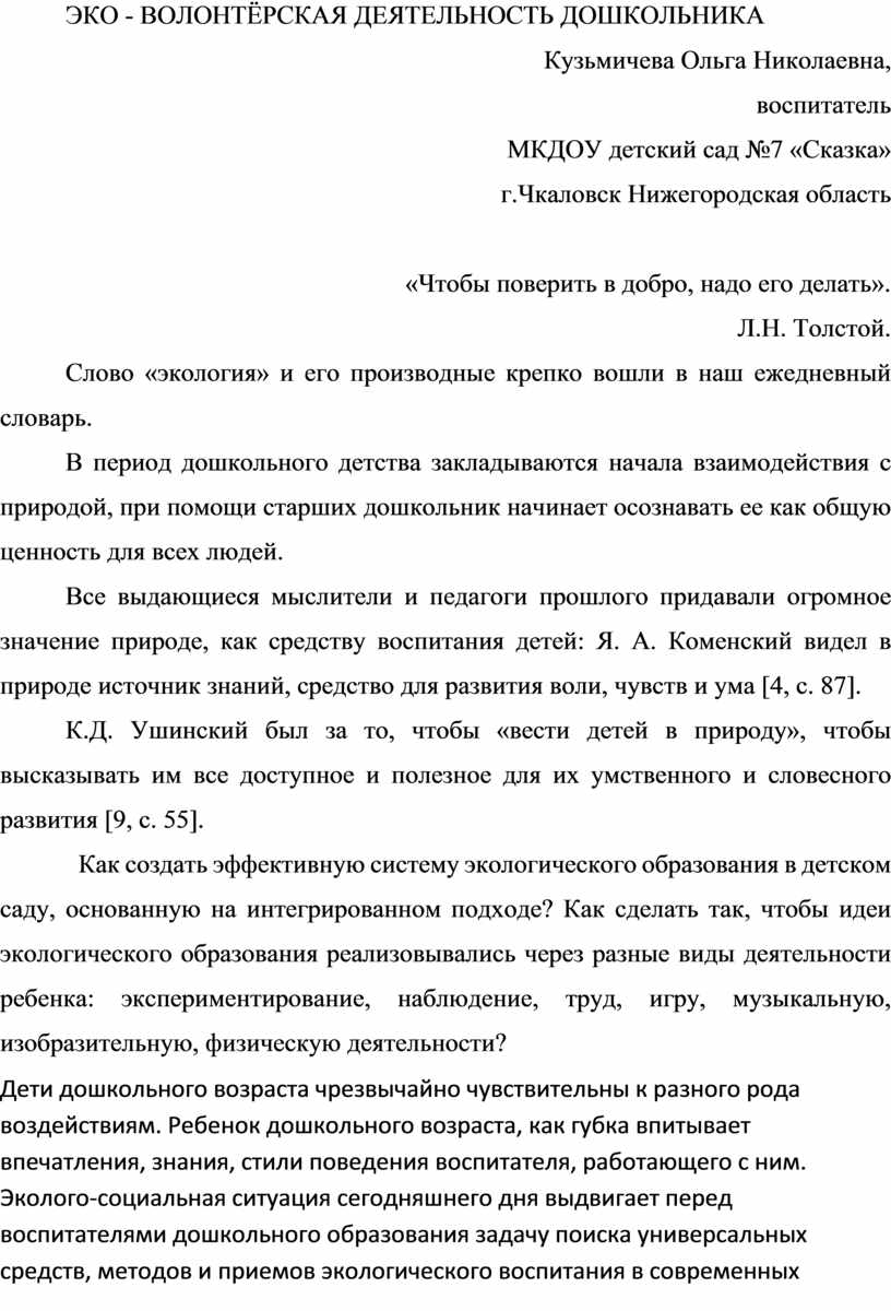 Эко - волонтёрская деятельность дошкольника