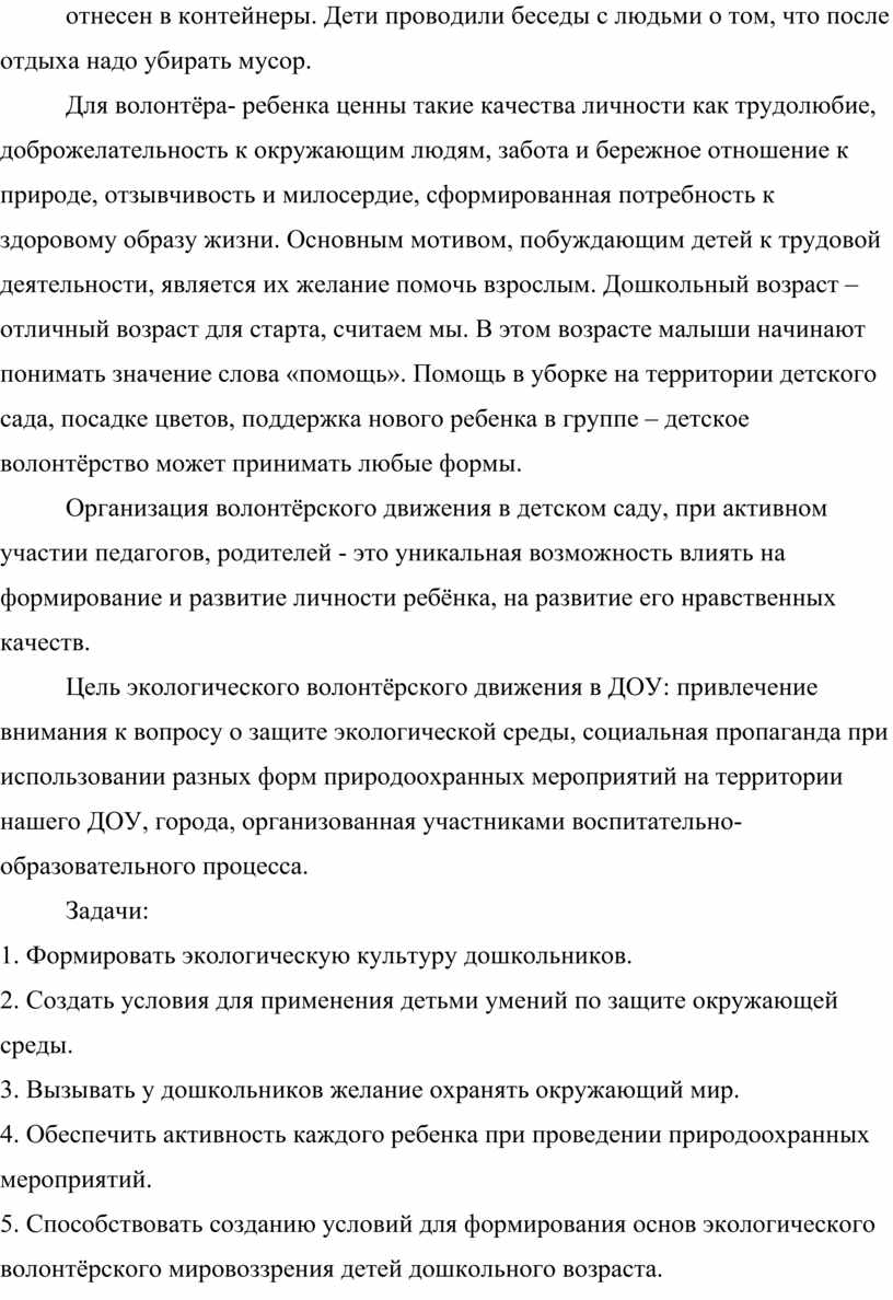 5. Способствовать созданию условий для формирования основ экологического волонтёрского мировоззрения детей дошкольного возраста.