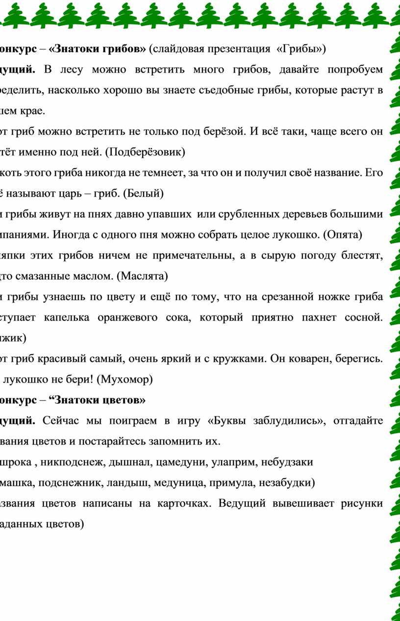 Ведущий. В лесу можно встретить много грибов, давайте попробуем определить, насколько хорошо вы знаете съедобные грибы, которые растут в нашем крае.