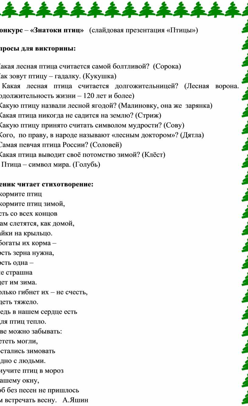 7) Кого, по праву, в народе называют «лесным доктором»? (Дятла)